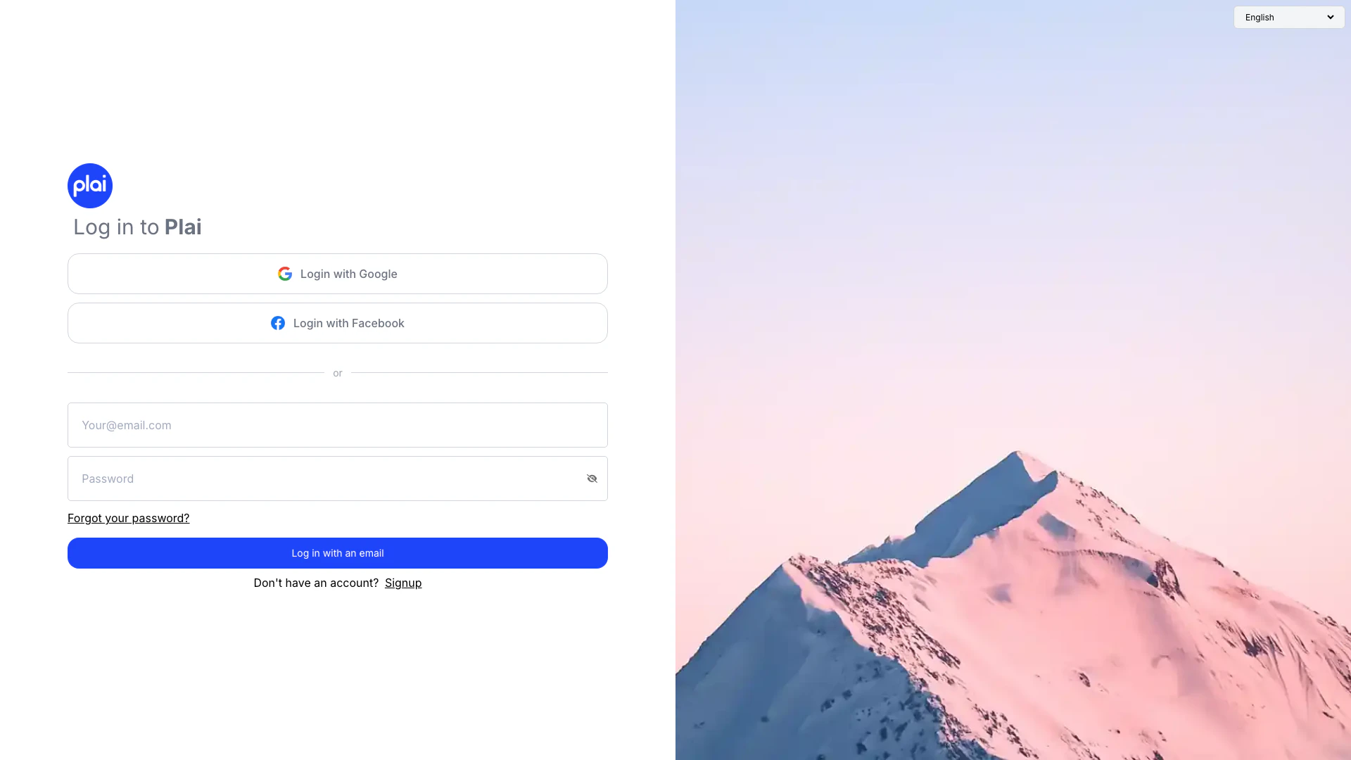 - Melden Sie sich auf der Plai-Website an, indem Sie Ihre E-Mail-Adresse angeben oder Ihr Google-/Facebook-Konto für eine schnelle Anmeldung verwenden.