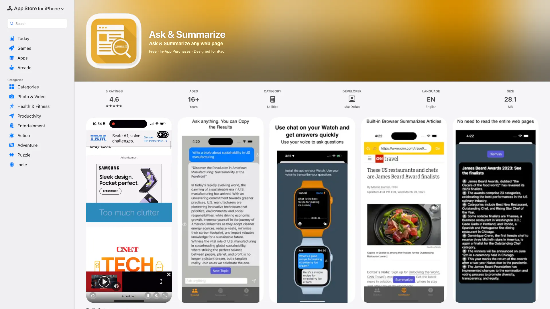 Ask Summarize ist eine App, mit der Sie Artikel direkt aus Ihrem bevorzugten Browser zusammenfassen können, um Zeit und Mühe zu sparen. Sie ermöglicht es den Benutzern auch, Fragen über Siri zu stellen und sofortige Antworten zu erhalten.