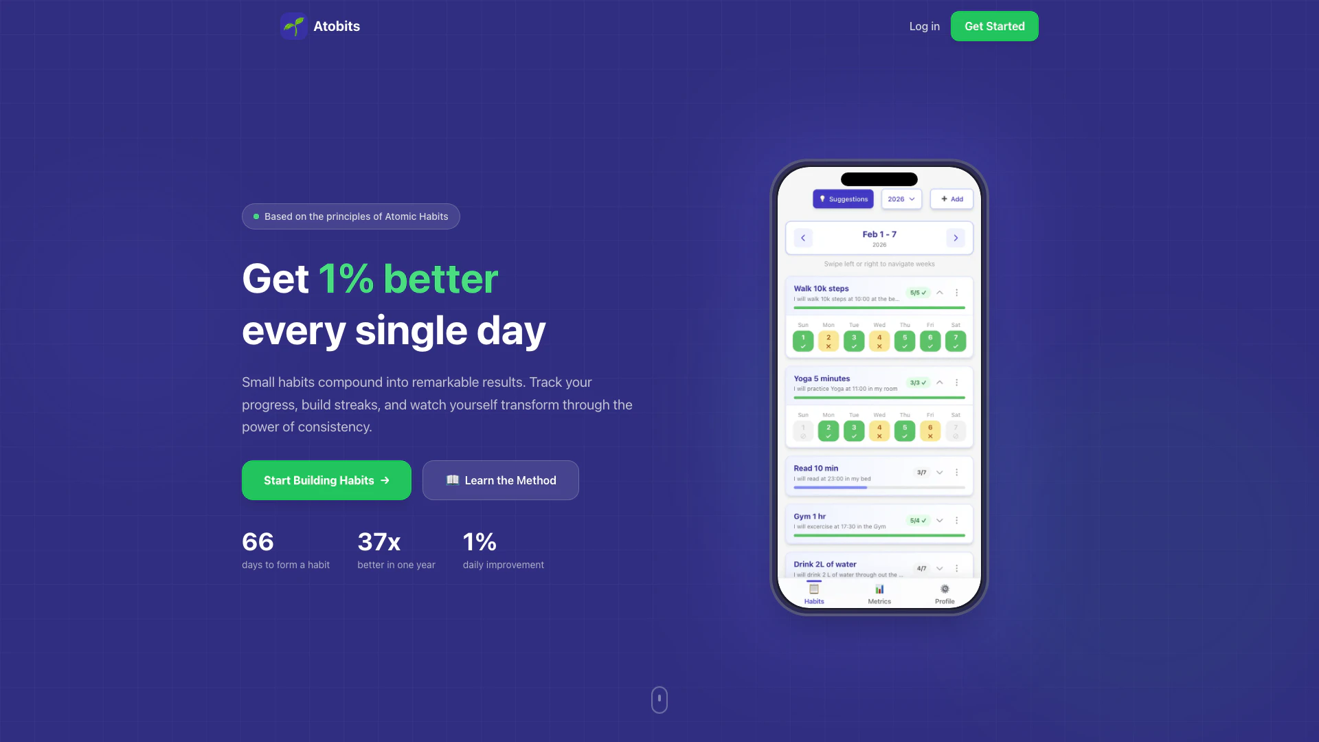 Definieren Sie die Gewohnheiten, die Sie aufbauen möchten, und haken Sie sie jeden Tag mit einem einzigen Tipp ab. Atobits verfolgt Ihre Serien, zeigt Ihre Konsistenz in einem visuellen Raster und gibt Ihnen umsetzbare Einblicke - alles basierend auf den bewährten Prinzipien aus "Atomic Habits" von James Clear.