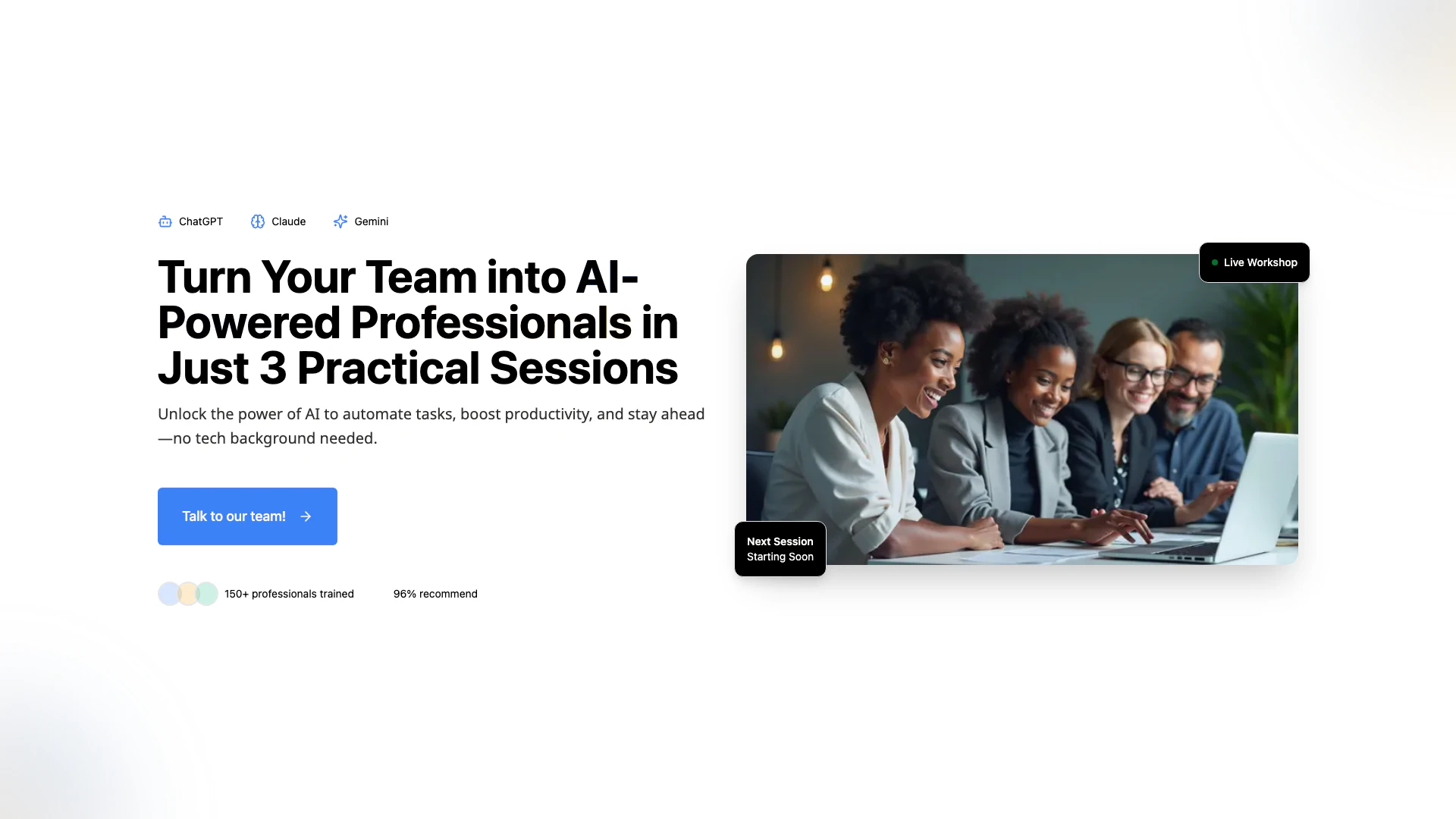 - Praktische AI-Schulung: Bamble bietet praktische Workshops an, die Teams befähigen, KI-Tools wie ChatGPT, Claude und Gemini effektiv zu nutzen, ohne dass ein technischer Hintergrund erforderlich ist.