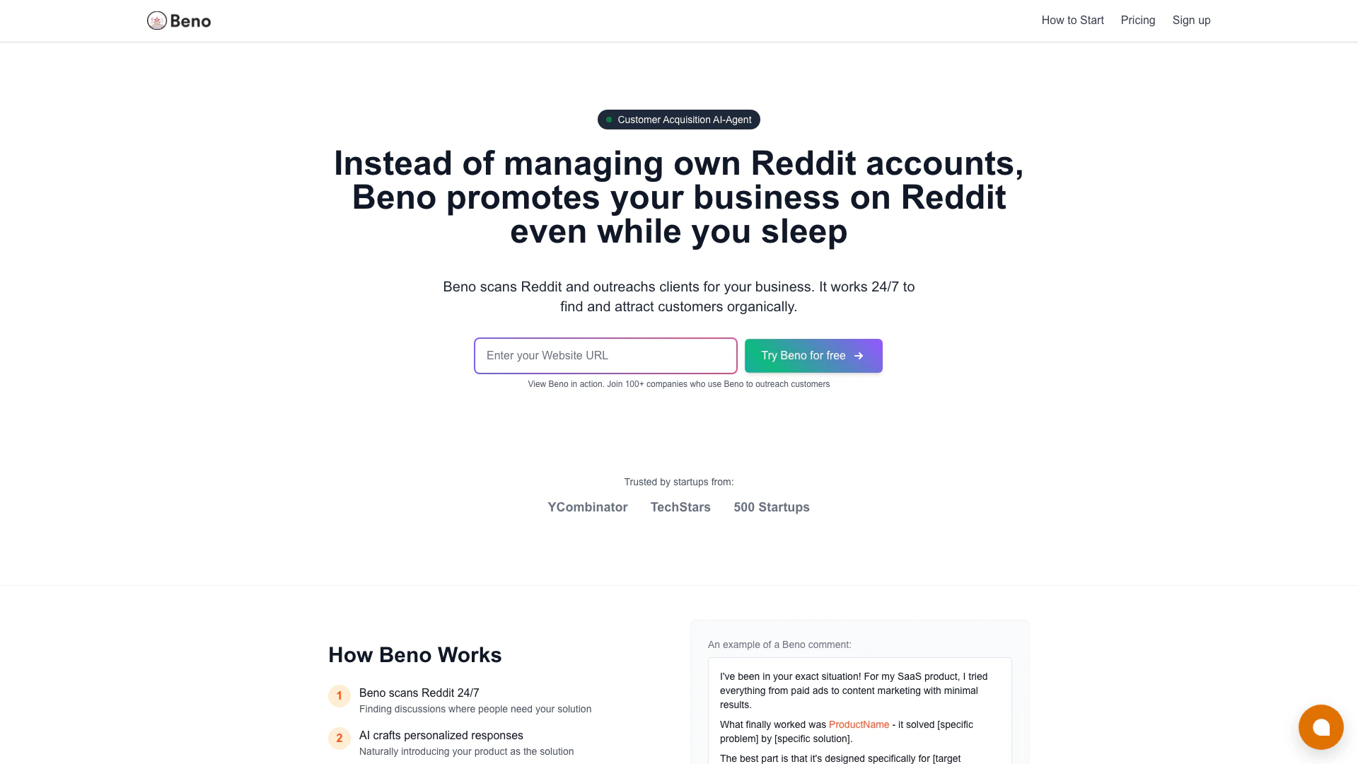 - 24/7 Automatisierte Kundenakquise: Beno arbeitet kontinuierlich, um relevante Diskussionen auf Reddit zu finden, und fördert Ihr Produkt sogar, während Sie schlafen, um eine ständige Kundenbindung sicherzustellen.