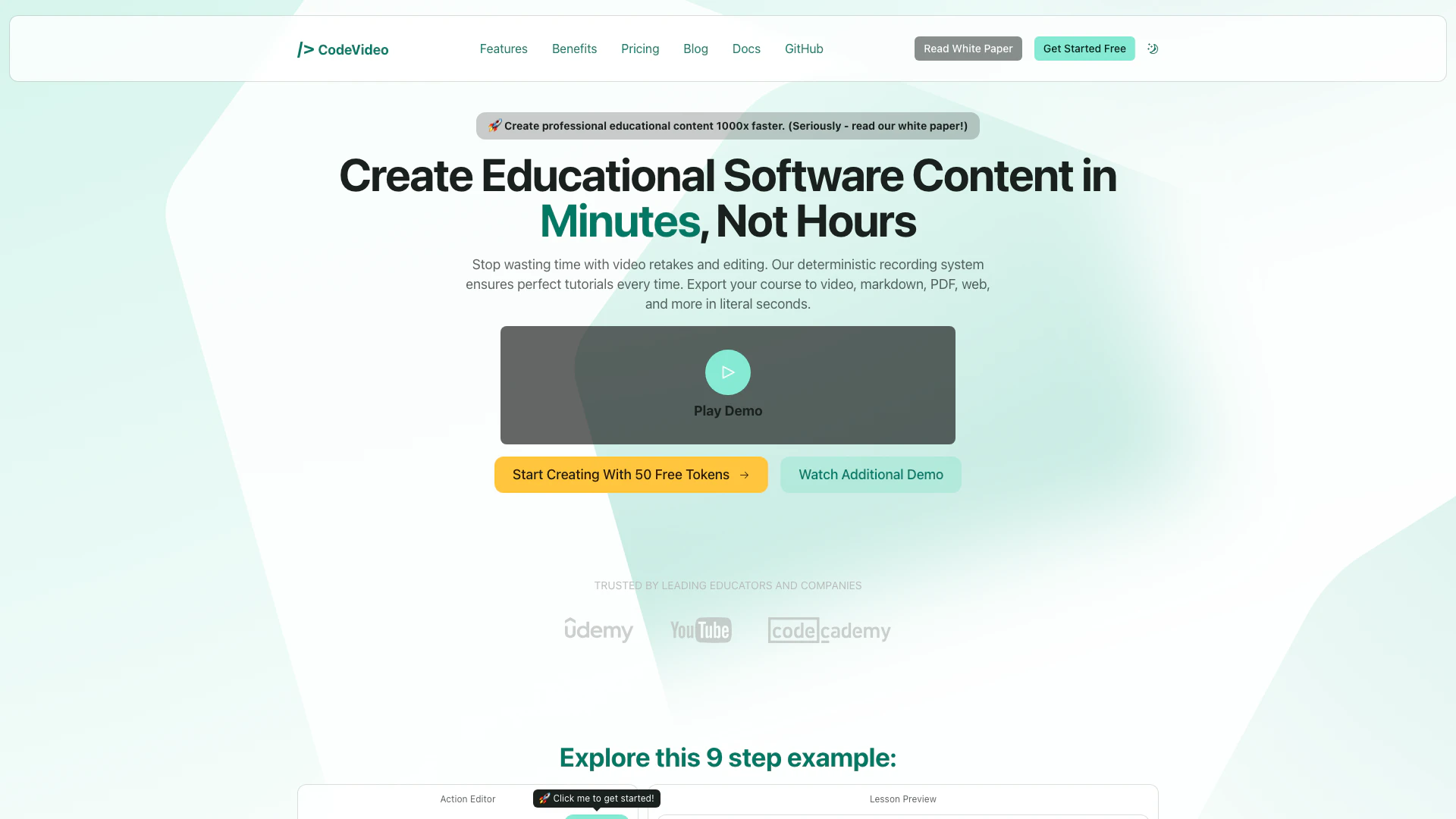 - Schnelle Inhaltserstellung: CodeVideo ermöglicht es den Benutzern, Bildungsinhalte 1000-mal schneller als traditionelle Methoden zu erstellen, was die Produktionszeit erheblich verkürzt.