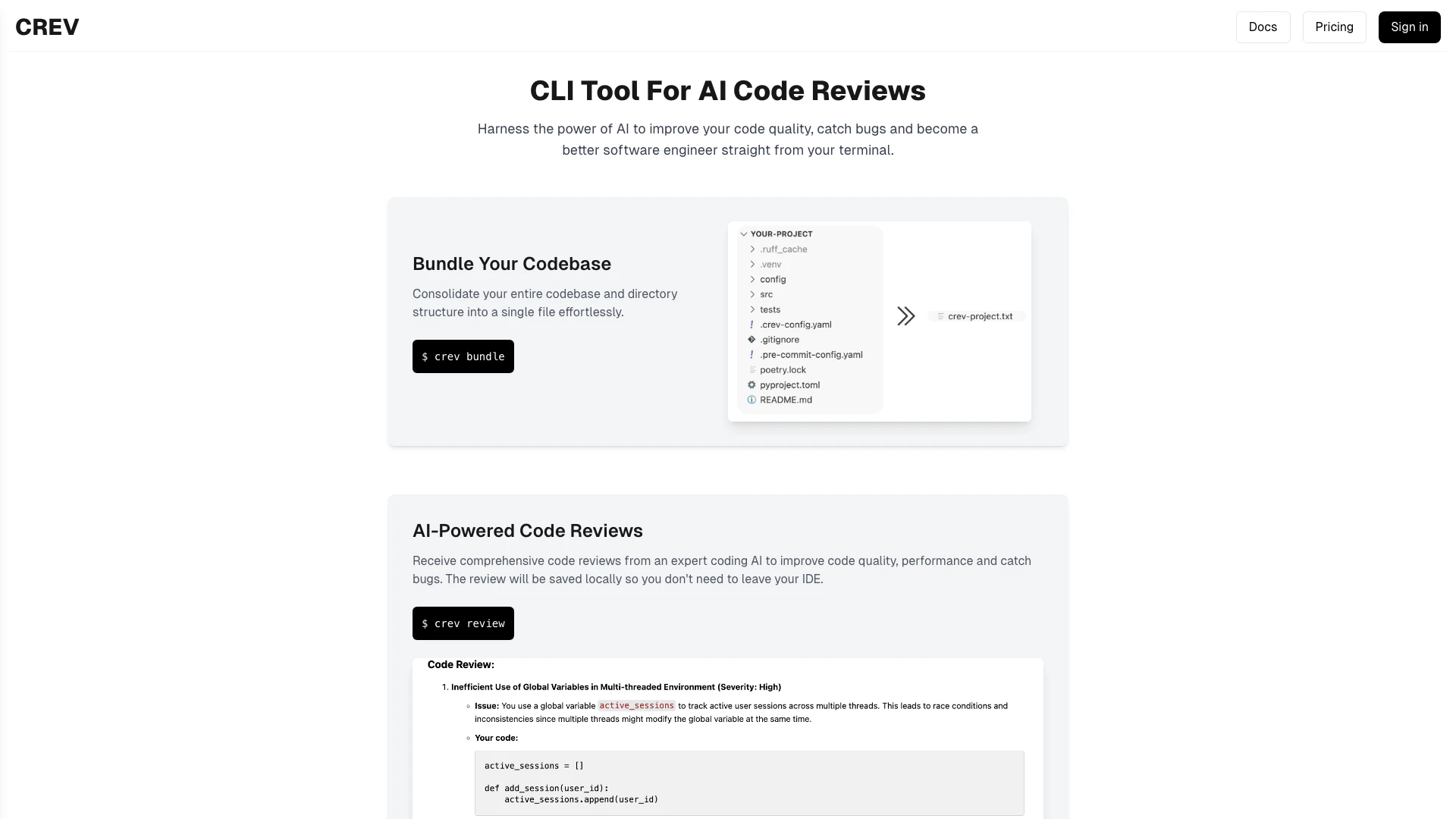 - Erhalten Sie Codeüberprüfungen: Führen Sie den Befehl `crev review` aus, um KI-gestützte Codeüberprüfungen zu erhalten, die Ihnen helfen, die Codequalität, Leistung und Sicherheit zu verbessern.