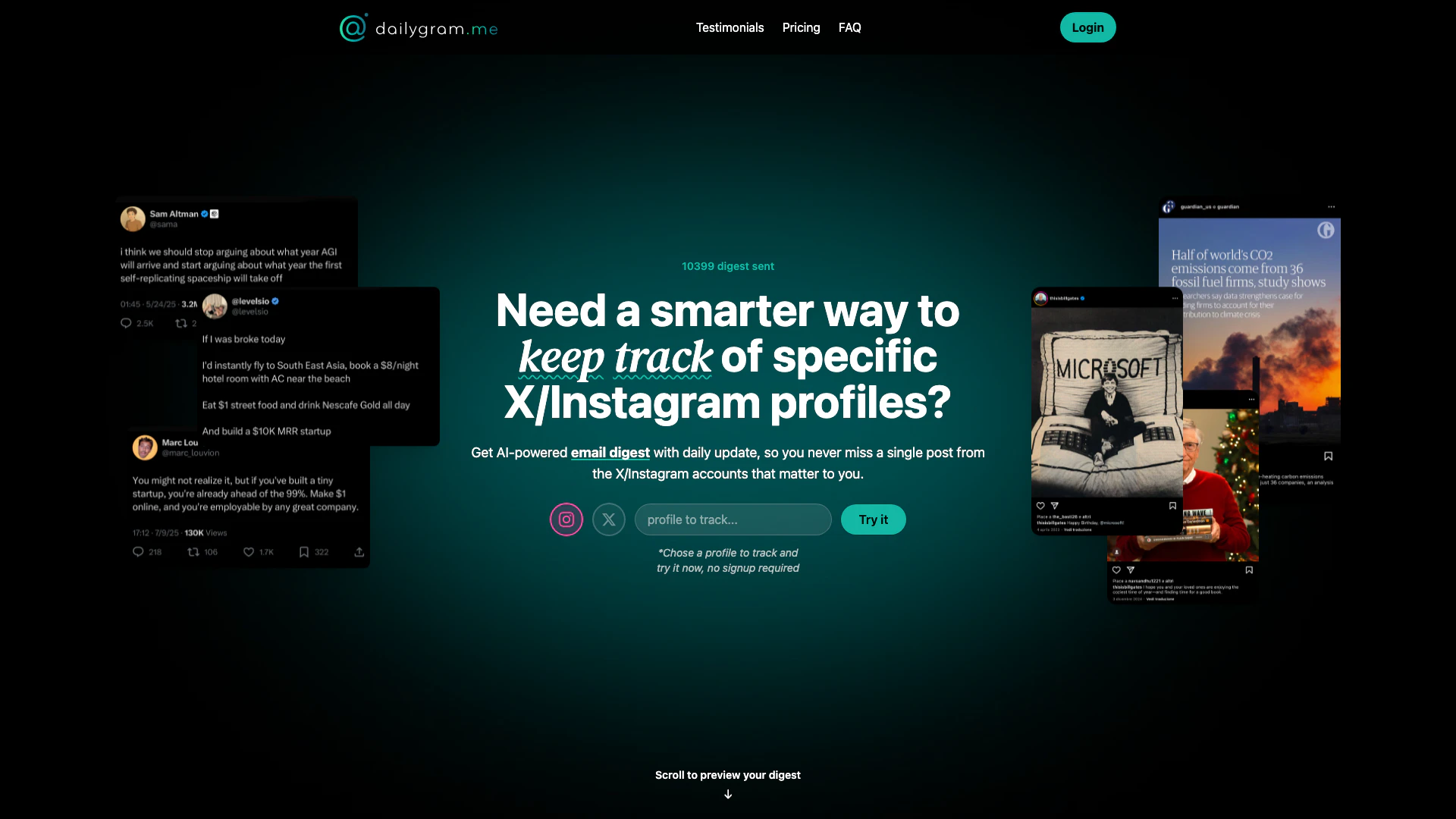 - Keine Kontoverknüpfung erforderlich: Dailygram ermöglicht es Benutzern, Profile zu überwachen, ohne sich bei Instagram oder X/Twitter anmelden zu müssen, was Privatsphäre und Benutzerfreundlichkeit gewährleistet.