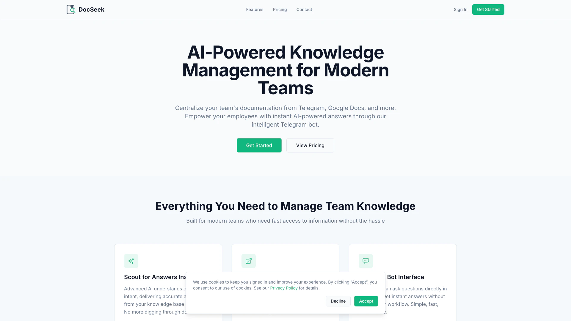 Docseek ist ein Tool, das die Dokumentation Ihres Teams aus verschiedenen Quellen wie Telegram und Google Docs zentralisiert und sofortige, KI-gestützte Antworten über einen intelligenten Telegram-Bot bereitstellt.
