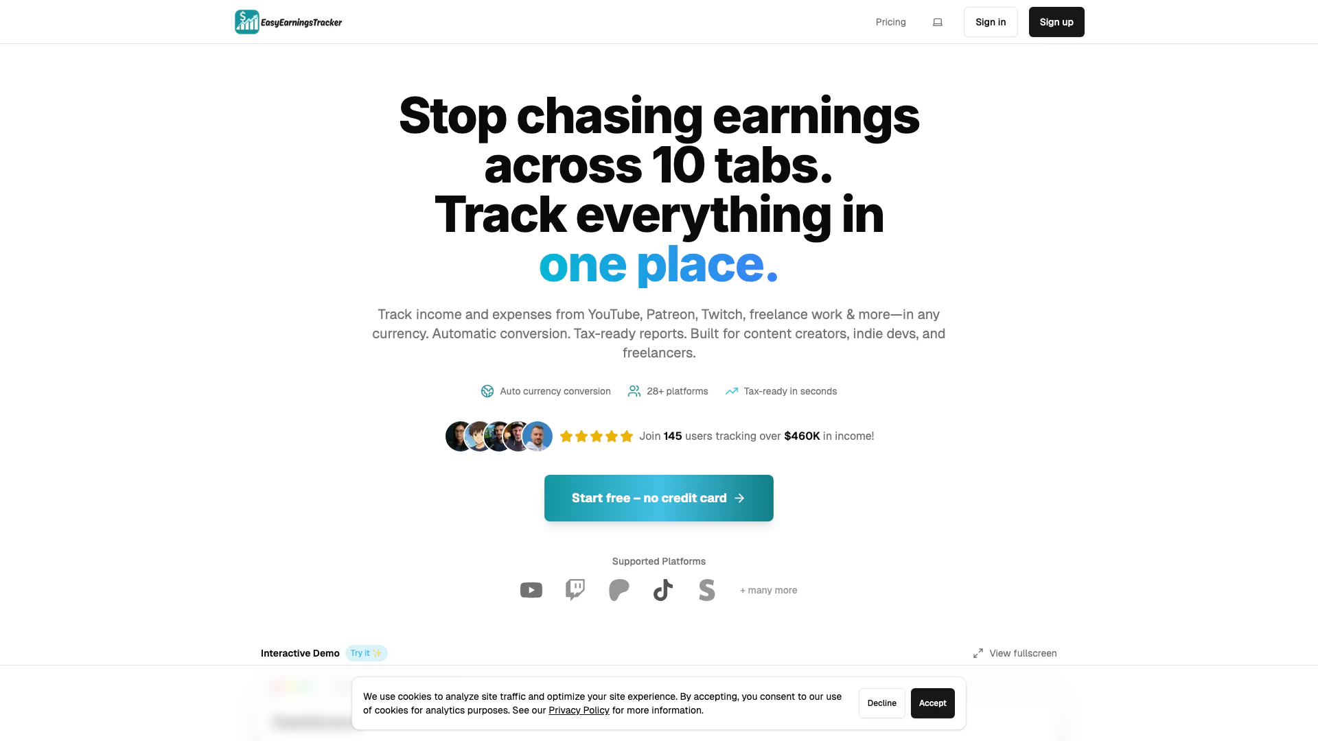 - Integration mehrerer Plattformen: Verfolgen Sie Einnahmen aus über 28 Plattformen, einschließlich YouTube, Twitch, Patreon und Upwork.