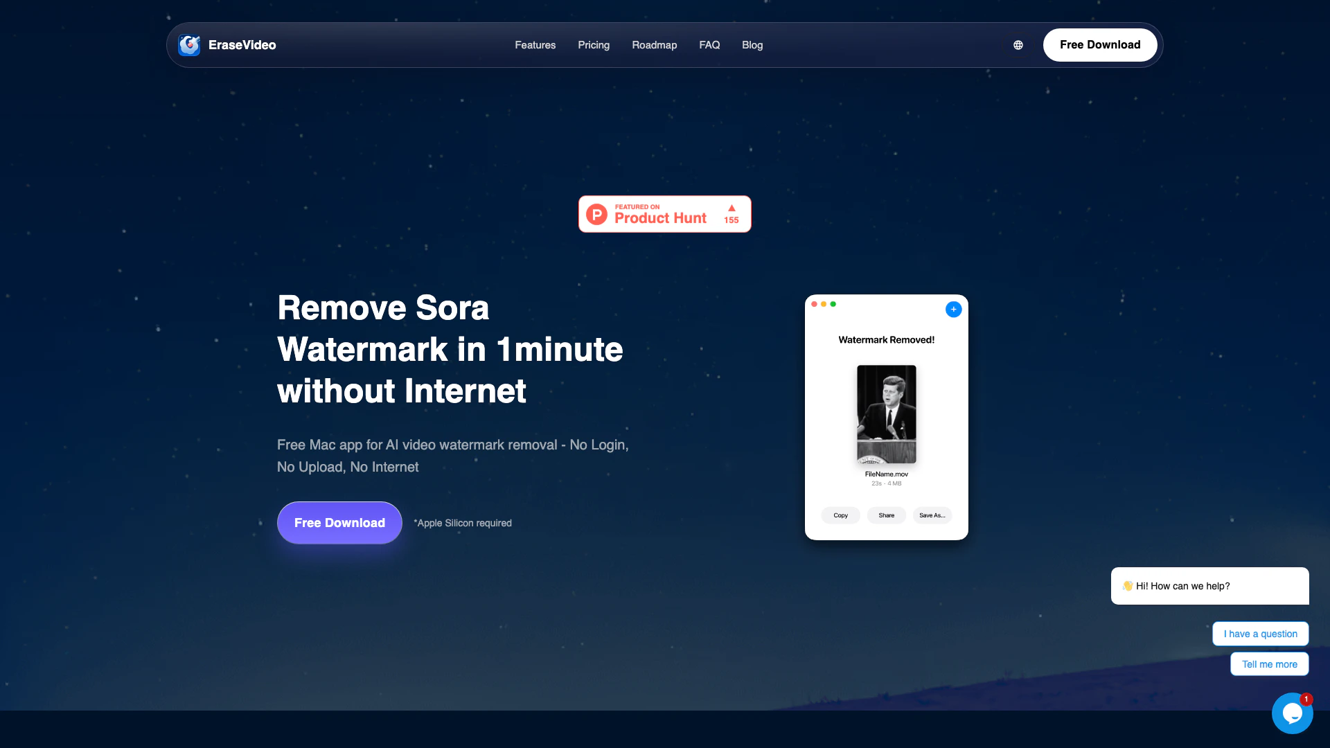EraseVideo ist eine leistungsstarke Mac-Anwendung, die entwickelt wurde, um KI-Wasserzeichen von Videos sofort zu entfernen. Sie ermöglicht es den Benutzern, Wasserzeichen von beliebten KI-Video-Plattformen wie Sora, Veo3 und Keling zu entfernen, ohne dass eine Internetverbindung, ein Login oder Video-Uploads erforderlich sind. Die App garantiert schnelle, private und professionelle Ergebnisse in nur wenigen Minuten und ist somit eine ideale Lösung für Content-Ersteller, die die Integrität ihrer Videos wahren möchten.