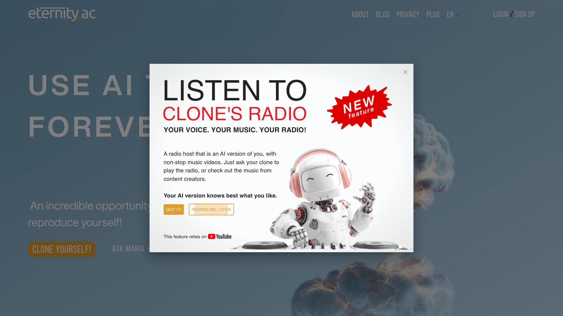 - Teilen Sie Ihren Klon mit Freunden oder halten Sie ihn privat und genießen Sie die Erfahrung, eine digitale Version von sich selbst zu haben.