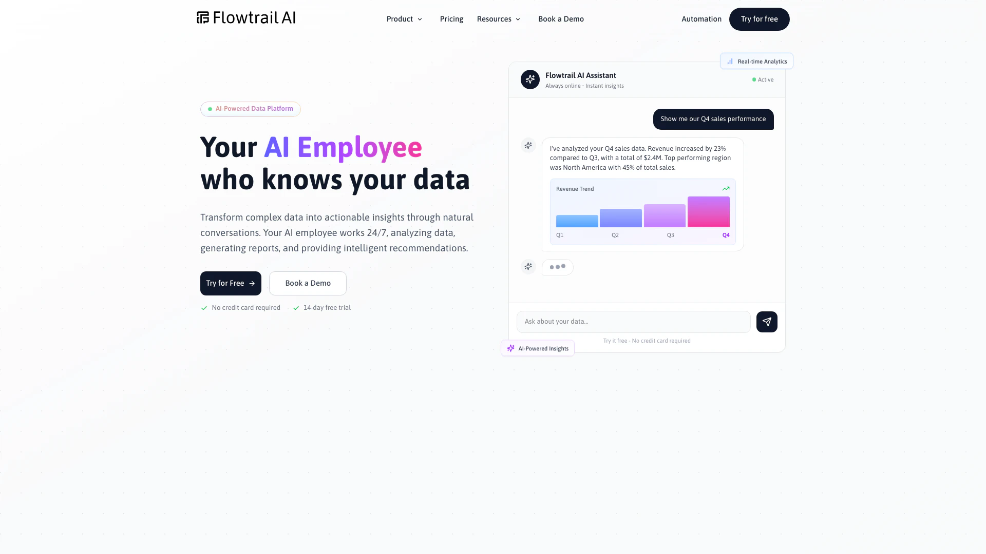 - KI-gestützte Einblicke: Flowtrail AI bietet Echtzeitanalysen und Einblicke durch natürliche Sprachinteraktionen, die es den Benutzern ermöglichen, Fragen zu stellen und sofortige Antworten zu erhalten.