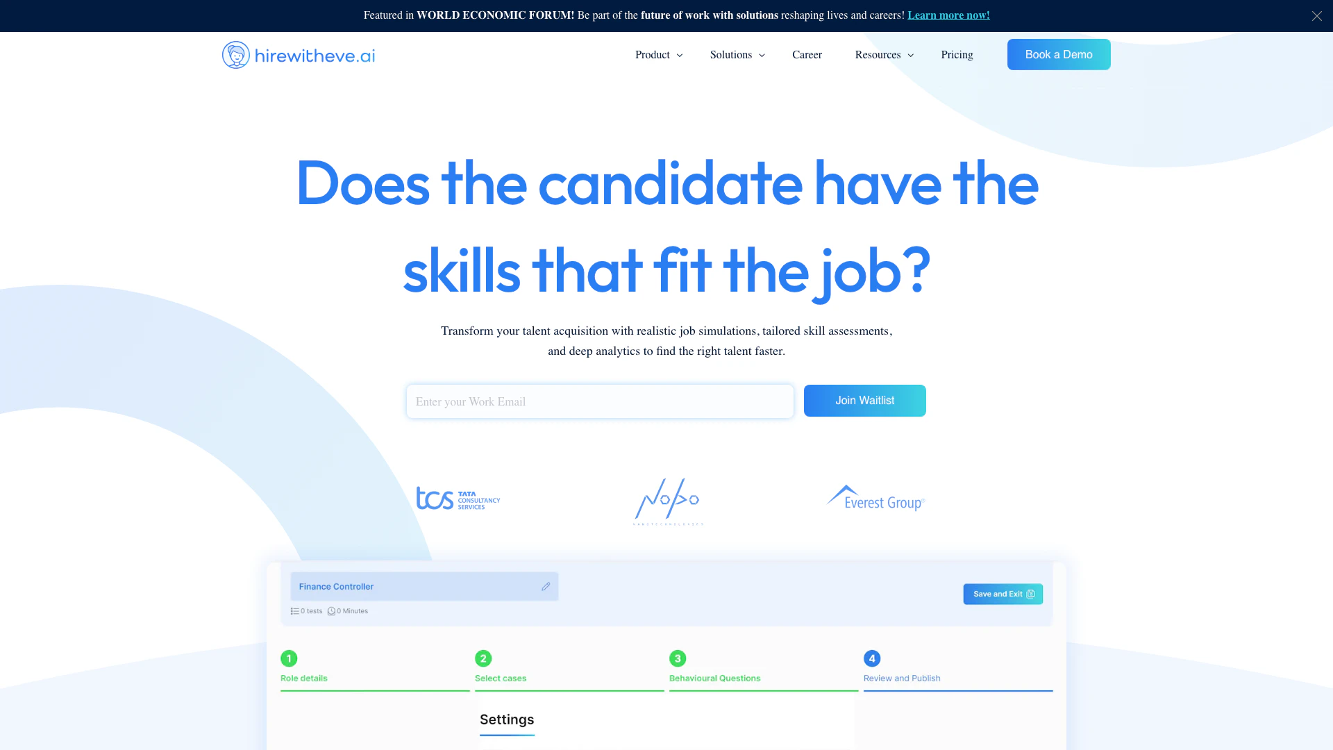 HirewithEve.ai ist eine innovative, KI-gesteuerte Rekrutierungsplattform, die darauf abzielt, den Einstellungsprozess zu optimieren, indem sie realistische Job-Simulationen, maßgeschneiderte Fähigkeitsbewertungen und umfassende Analysen bereitstellt. Diese Plattform, die im Weltwirtschaftsforum vorgestellt wurde, konzentriert sich darauf, das Kandidatenerlebnis zu verbessern und die Qualität der Einstellungen zu steigern. Durch den Einsatz von KI-Technologie ermöglicht es HirewithEve.ai Organisationen, fundierte Einstellungsentscheidungen basierend auf Verdiensten und nicht auf dem Hintergrund zu treffen, wodurch die Zukunft der Arbeit neu gestaltet wird.