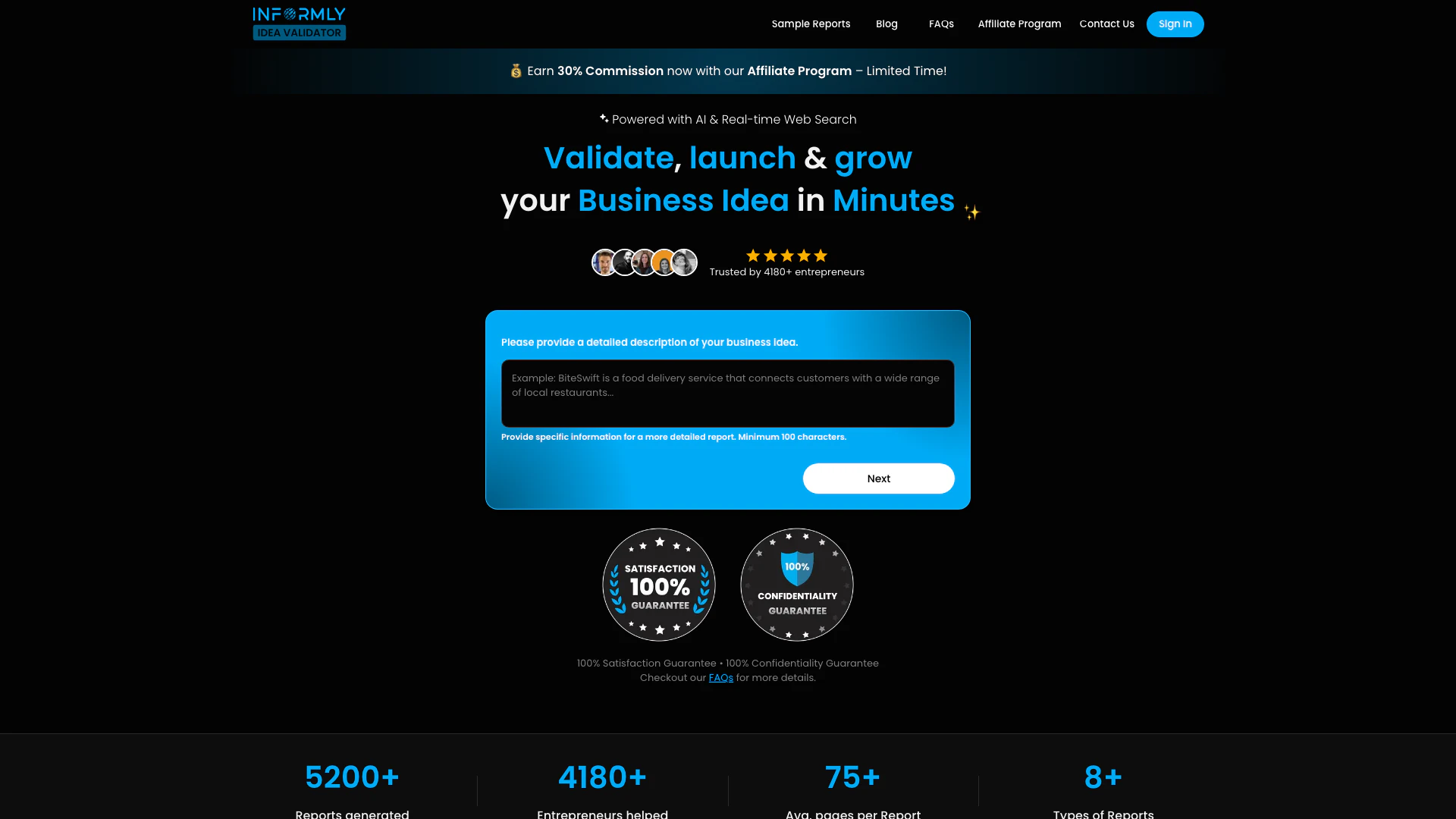 - Personalisierte Ideenvalidierungsberichte: Erstellen Sie maßgeschneiderte Berichte, die die Durchführbarkeit Ihrer Geschäftsidee bewerten.