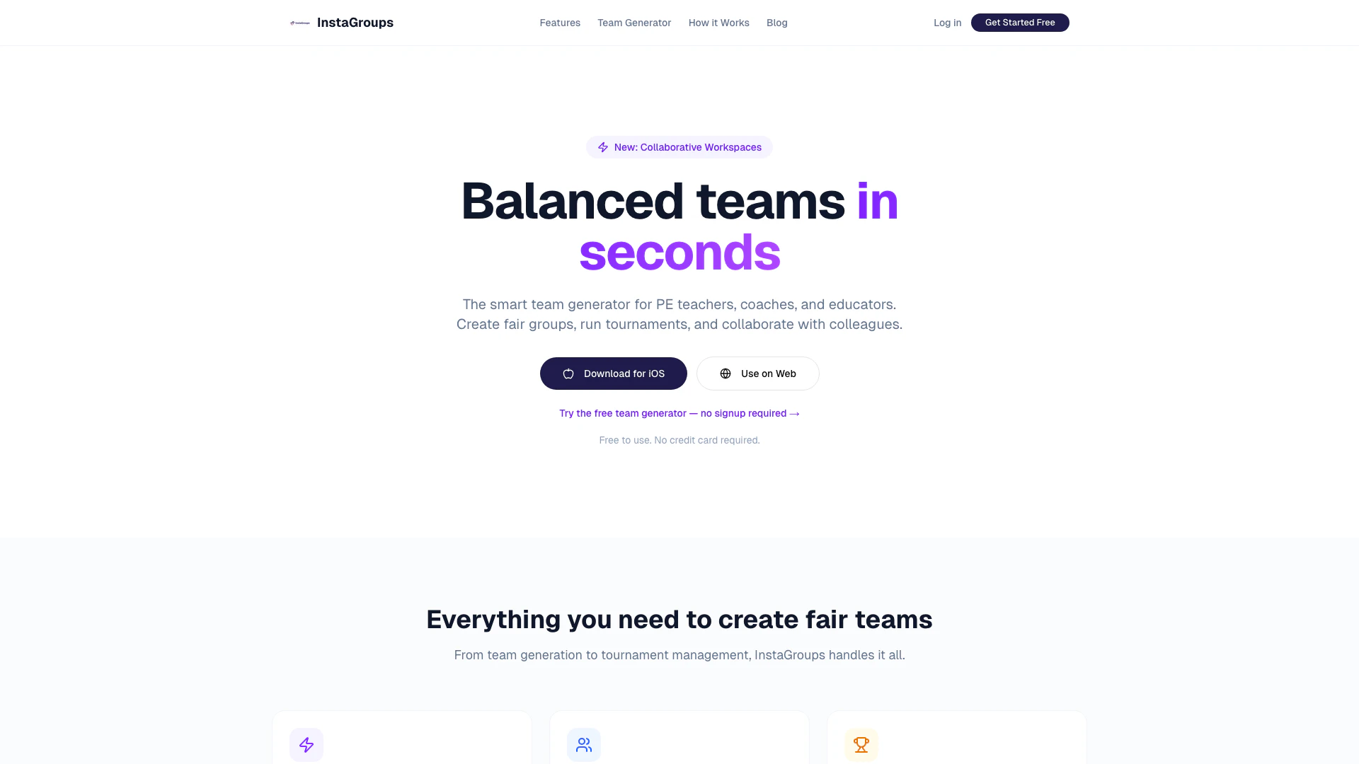 Instagroups ist ein intelligenter Teamgenerator, der speziell für Sportlehrer, Trainer und Pädagogen entwickelt wurde. Dieses innovative Tool ermöglicht es den Nutzern, schnell und effizient ausgewogene Teams zu erstellen und Fairness in der Gruppendynamik zu gewährleisten. Mit seinen robusten Funktionen vereinfacht Instagroups den Prozess der Teambildung, Turnierverwaltung und Zusammenarbeit unter Kollegen und ist eine unverzichtbare Ressource für Pädagogen, die im Sport- und Bewegungsbereich tätig sind.