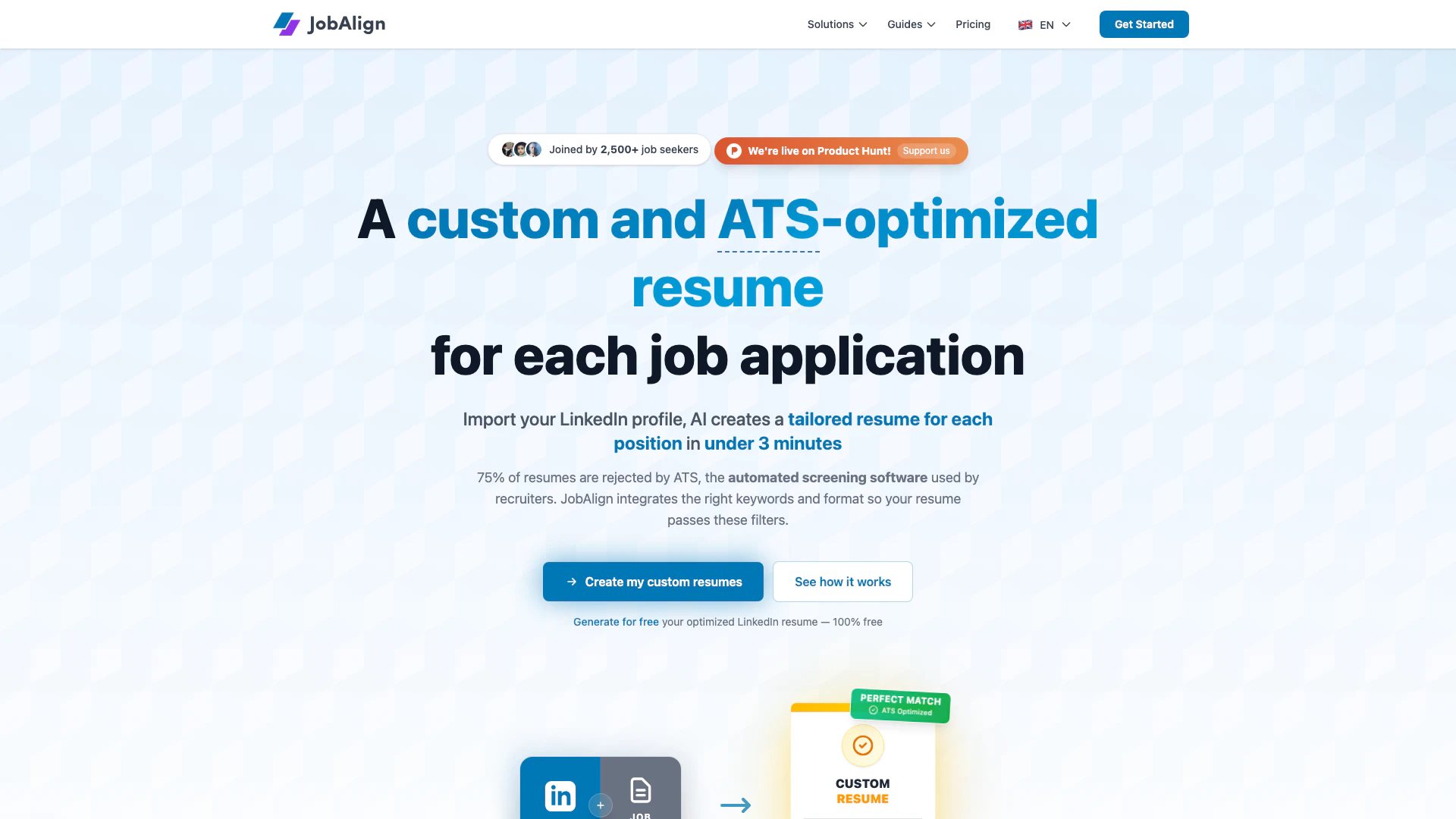 Mit JobAlign verbinden Sie einfach Ihr LinkedIn-Konto mit einem Klick über unsere Browsererweiterung (verfügbar für Chrome, Firefox, Safari, Edge und Opera). Ihre Berufserfahrungen, Fähigkeiten und Ausbildungen werden automatisch importiert. Fügen Sie dann die URL oder den Text der Zieljobanzeige hinzu, und unsere KI erstellt in weniger als 3 Minuten einen personalisierten und ATS-optimierten Lebenslauf.