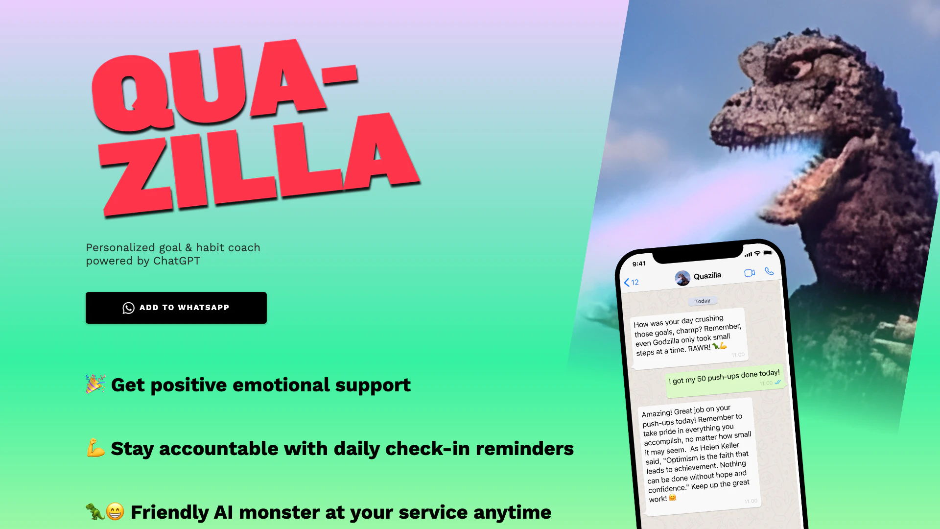 Joinsquad ist ein personalisiertes Coaching-Tool für Ziele und Gewohnheiten, das von ChatGPT unterstützt wird. Es dient als interaktiver Assistent, der den Nutzern hilft, ihre persönlichen Ziele durch positive emotionale Unterstützung und Verantwortung zu setzen und zu erreichen. Mit Joinsquad können die Nutzer tägliche Erinnerungen erhalten, um ihren Fortschritt zu überprüfen, was es einfacher macht, auf Kurs mit ihren Gewohnheiten zu bleiben. Das Tool verfügt über ein freundliches KI-Monster, das jederzeit Ermutigung und Unterstützung bietet und so das Nutzererlebnis und die Motivation verbessert.