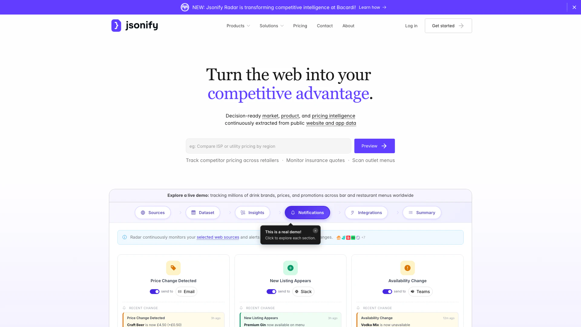 - Überwachung von Branchenänderungen: Jsonify ermöglicht es Organisationen, über Änderungen bei Preisen, Verfügbarkeit und Bewegungen von Wettbewerbern innerhalb ihrer Branche auf dem Laufenden zu bleiben.