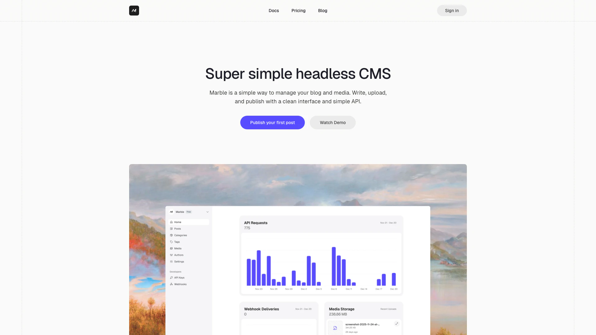 Marble ist ein headless CMS, das speziell für die Verwaltung von Blogs, Änderungsprotokollen und Artikeln entwickelt wurde. Es bietet eine einfache Benutzeroberfläche zum Erstellen und Organisieren von Inhalten sowie eine leistungsstarke API, um diese auf Ihrer Website oder App abzurufen und anzuzeigen.