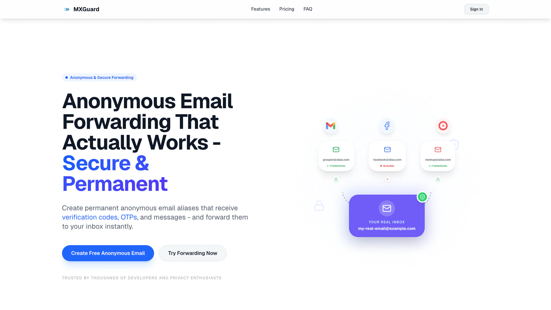 - Permanente anonyme E-Mail-Aliase: MXGuard ermöglicht es Benutzern, permanente anonyme E-Mail-Aliase zu erstellen, die Nachrichten an ihr primäres Postfach weiterleiten und so langfristigen Zugriff ohne Offenlegung persönlicher Informationen gewährleisten.