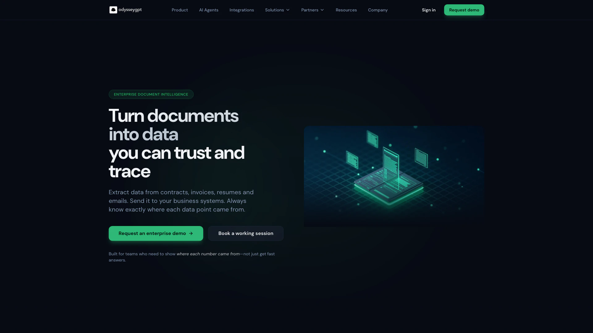 OdysseyGPT ist eine Plattform für Dokumentenintelligenz und IDP für Unternehmen, die unstrukturierte Dokumente in zitationsgestützte Kenntnisse und strukturierte Daten für HRIS, ATS, CRM, Buchhaltung und Ticketingsysteme umwandelt.