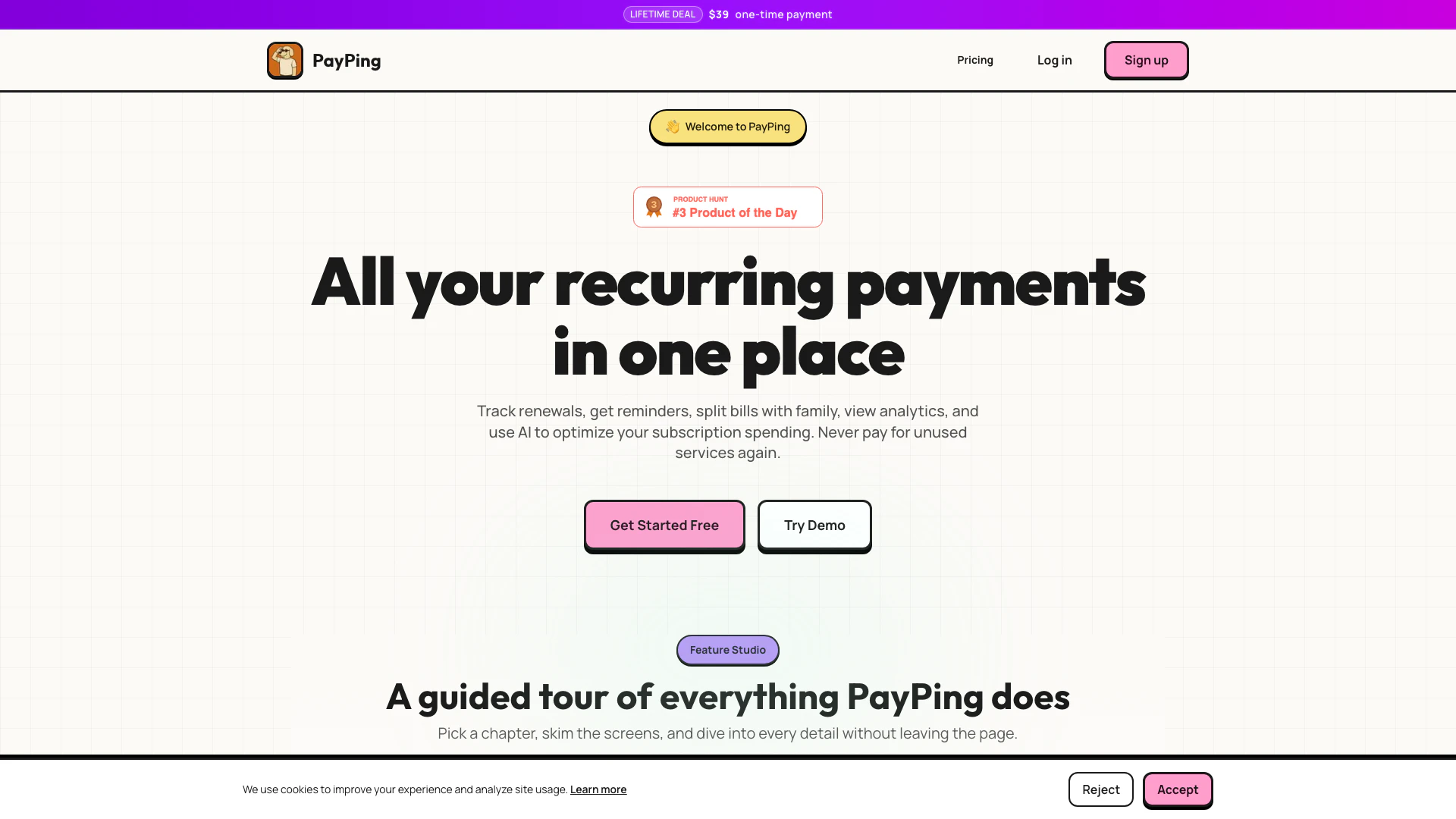 Payping ist ein umfassendes Tool zur Verwaltung von Abonnements, das Nutzern hilft, alle ihre Abonnements an einem Ort zu verwalten. Es ermöglicht Nutzern, Erneuerungen zu verfolgen, Erinnerungen zu erhalten, Rechnungen mit Familienmitgliedern zu teilen und ihre Ausgabemuster zu analysieren, um die Abonnementkosten zu optimieren. Mit Payping können Sie unerwartete Gebühren vermeiden und sicherstellen, dass Sie nicht für ungenutzte Dienste bezahlen. Die Plattform integriert KI-Funktionen, um Einblicke in Ihre Abonnementgewohnheiten zu geben, was die Finanzverwaltung erleichtert und Geld spart.
