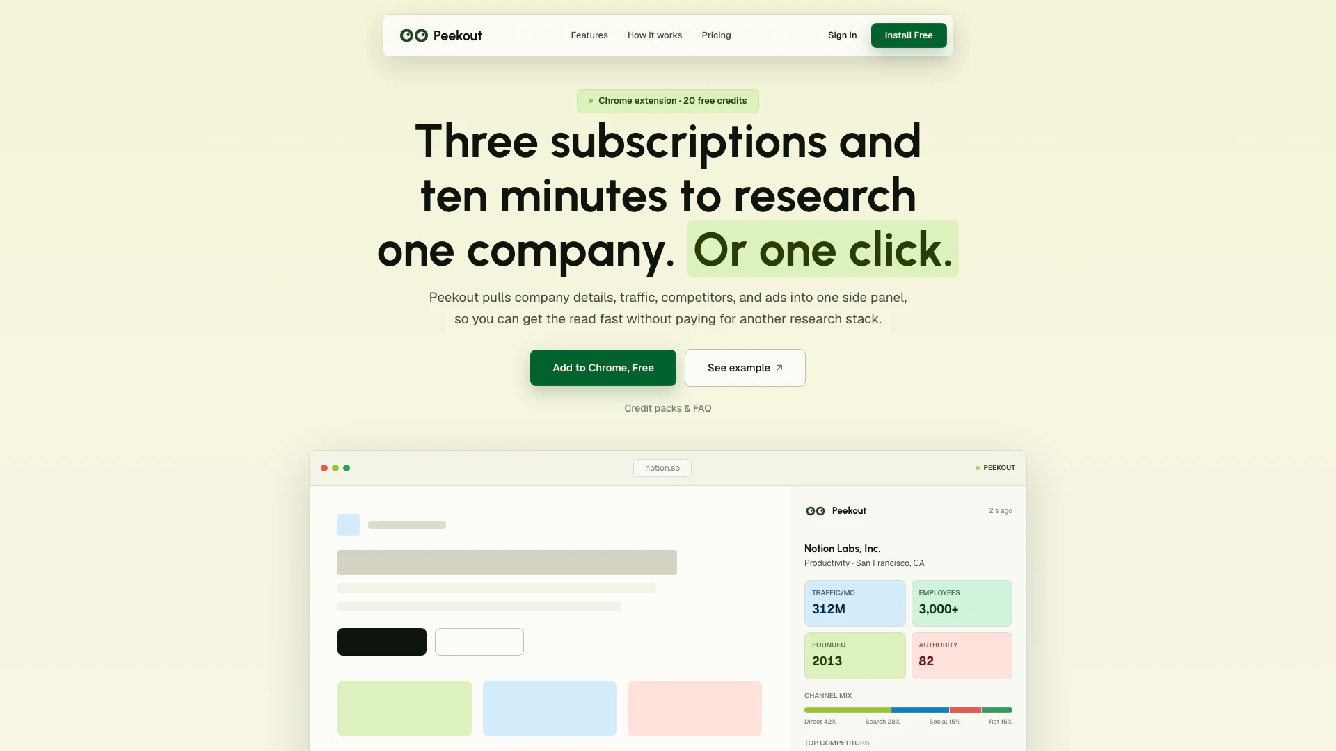 - Installieren Sie die Peekout-Erweiterung aus dem Chrome Web Store. 2. Durchsuchen Sie die Website eines Unternehmens wie gewohnt. 3. Klicken Sie auf das Peekout-Symbol in Ihrer Symbolleiste, um die vollständige Unternehmensübersicht in Sekunden zu laden.