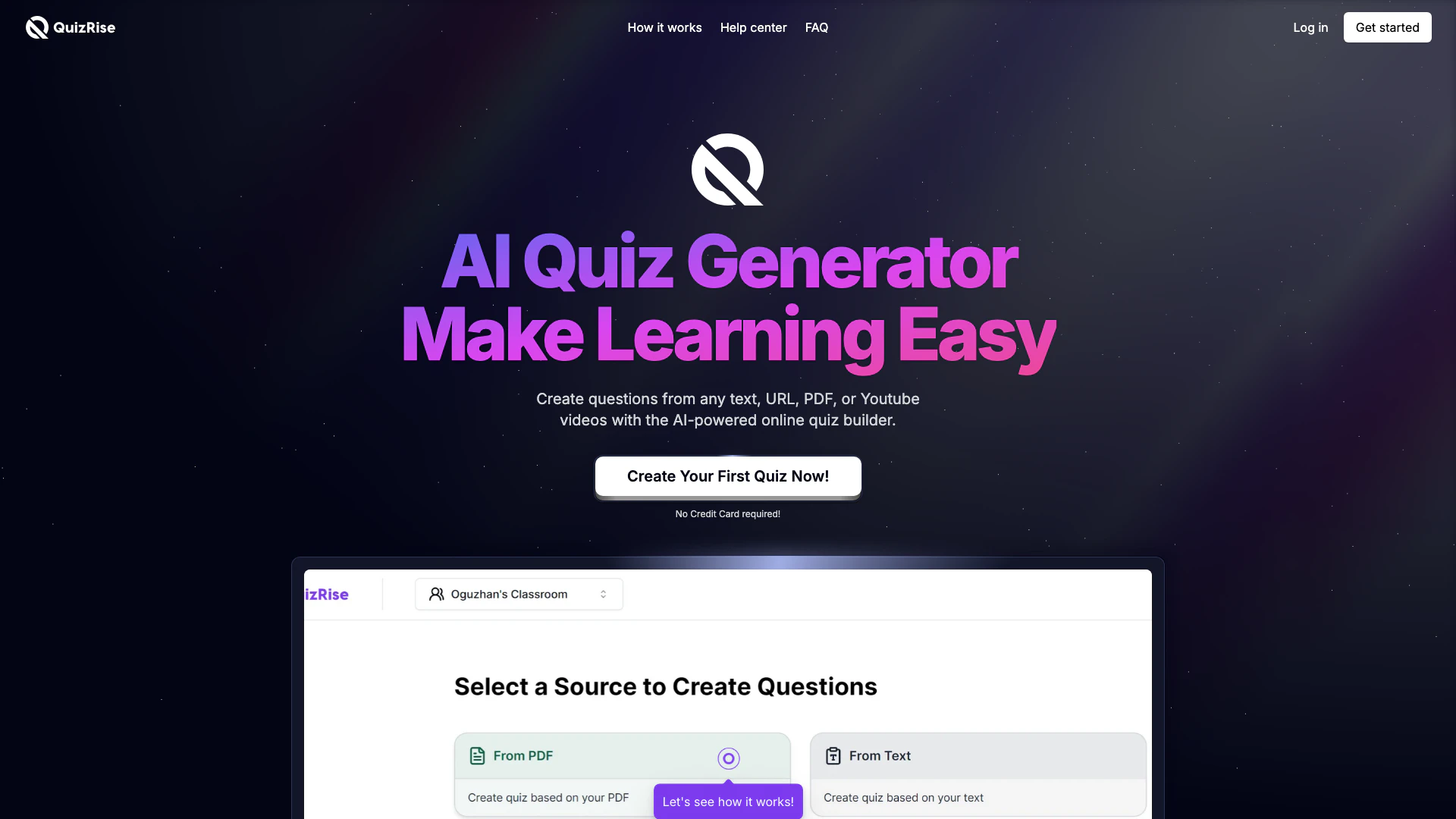 - Ein Quiz erstellen: Beginnen Sie damit, Ihren Inhalt hochzuladen oder eine URL einzufügen, und Quizrise analysiert es, um relevante Fragen zu generieren.