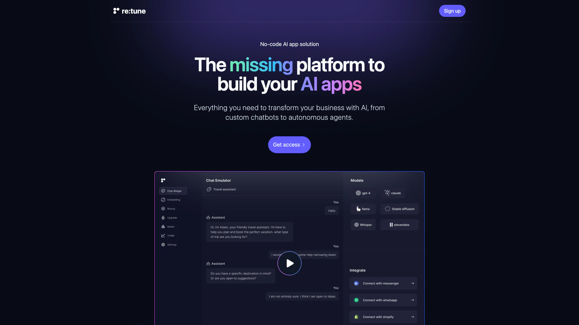 - No-Code KI-Anwendungsentwicklung: Retune ermöglicht es Benutzern, KI-Anwendungen ohne Programmierkenntnisse zu erstellen, was es für jeden zugänglich macht.