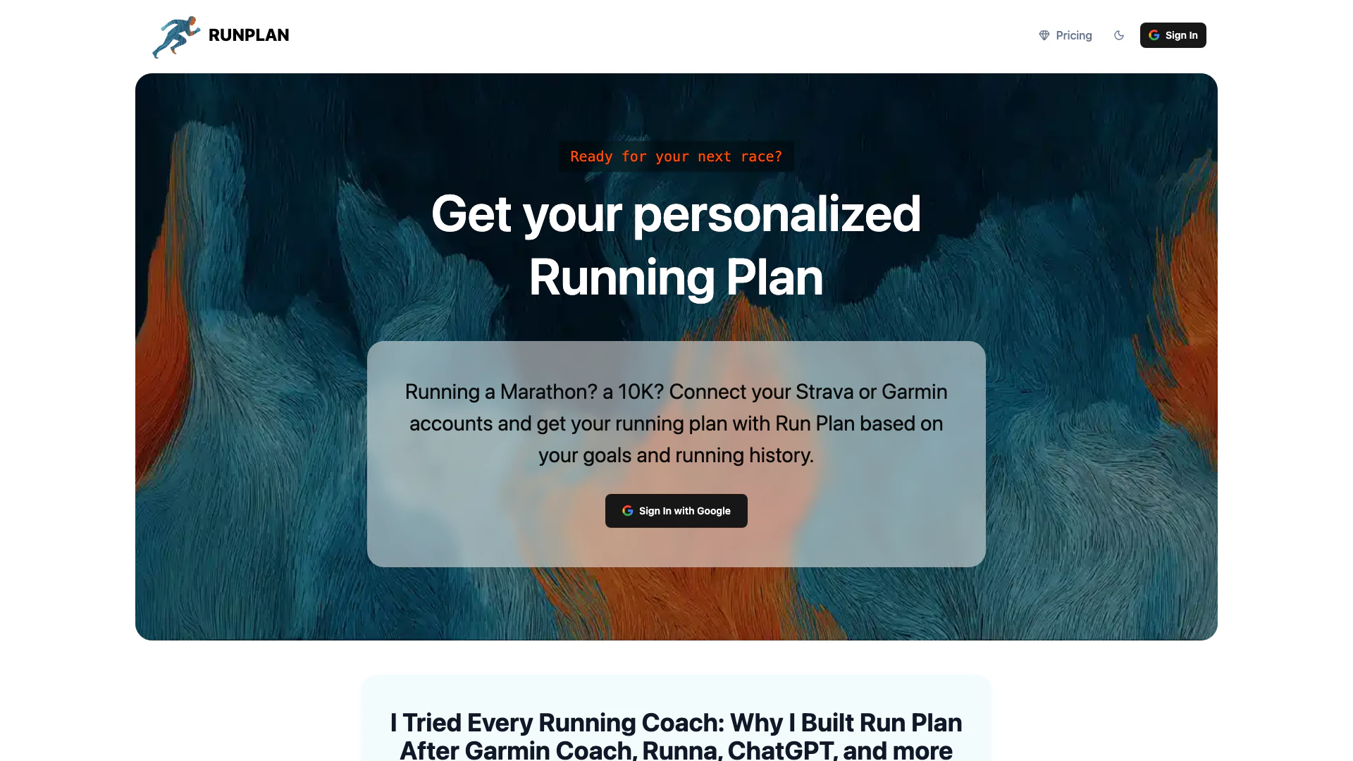 Der Run Plan ist ein personalisierter Laufcoach, der sich mit Ihren Strava- oder Garmin-Konten verbindet, um maßgeschneiderte Laufpläne basierend auf Ihren Zielen und Ihrer Laufhistorie zu erstellen.