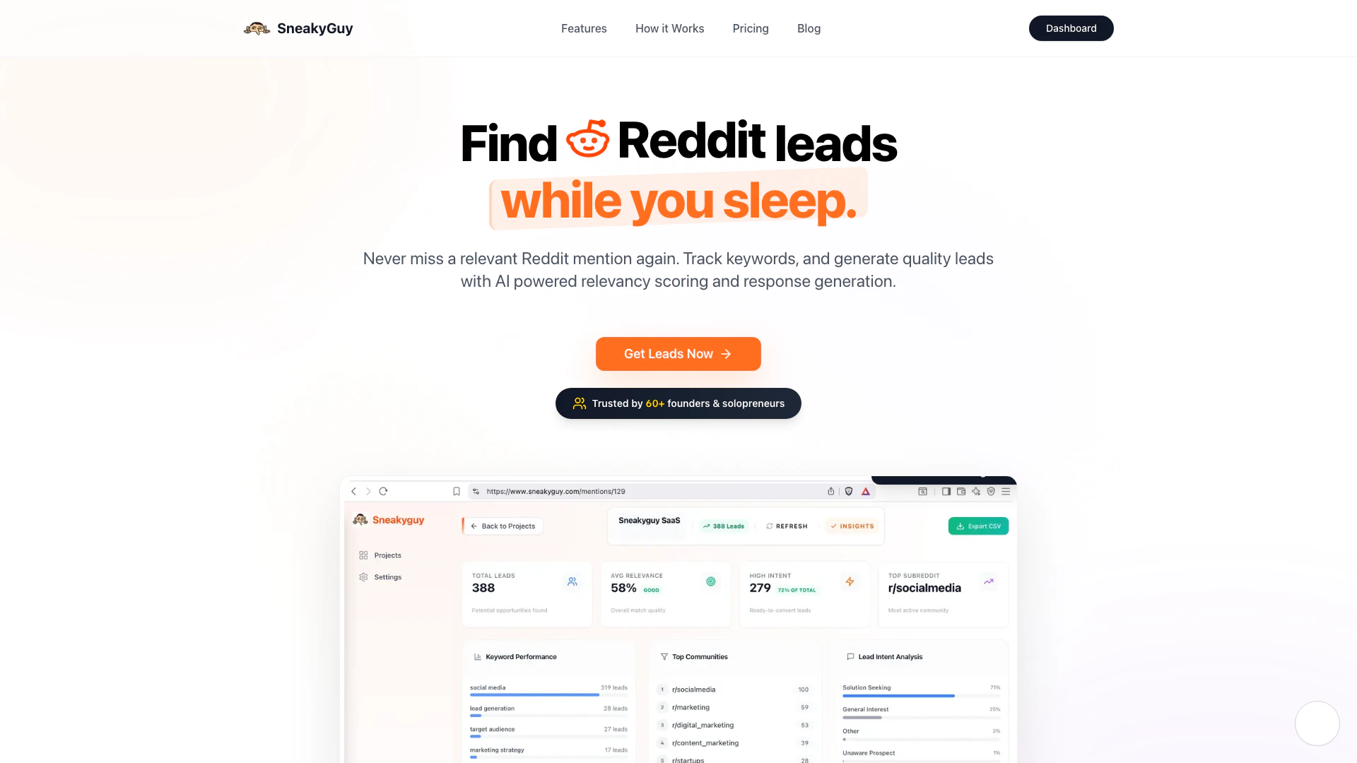 - KI-gestützte Lead-Generierung: SneakyGuy automatisiert den Lead-Generierungsprozess auf Reddit mithilfe von KI, sodass Benutzer Keywords verfolgen und mühelos Leads generieren können.