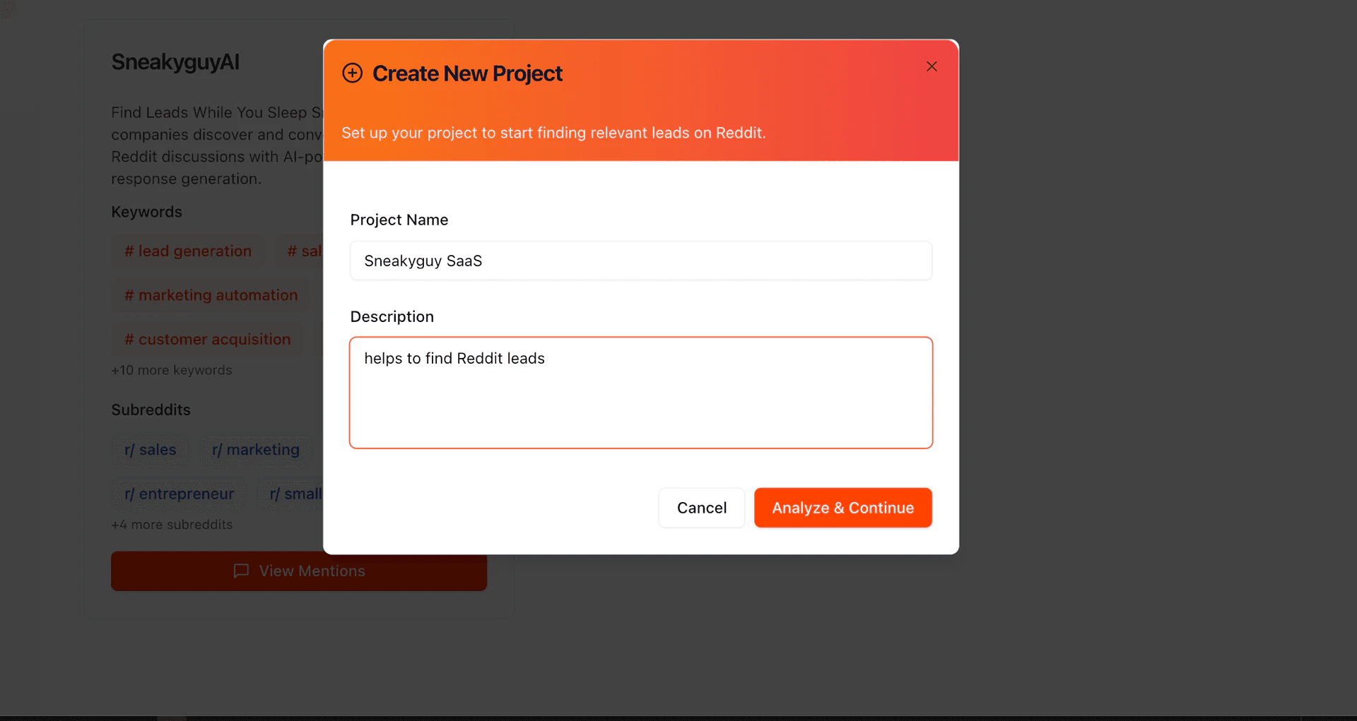 - Richten Sie Ihre Schlüsselwörter ein: Geben Sie Ihre Geschäftsschlüsselwörter ein und wählen Sie relevante Subreddits aus. SneakyGuy überwacht diese 24/7 auf potenzielle Leads.