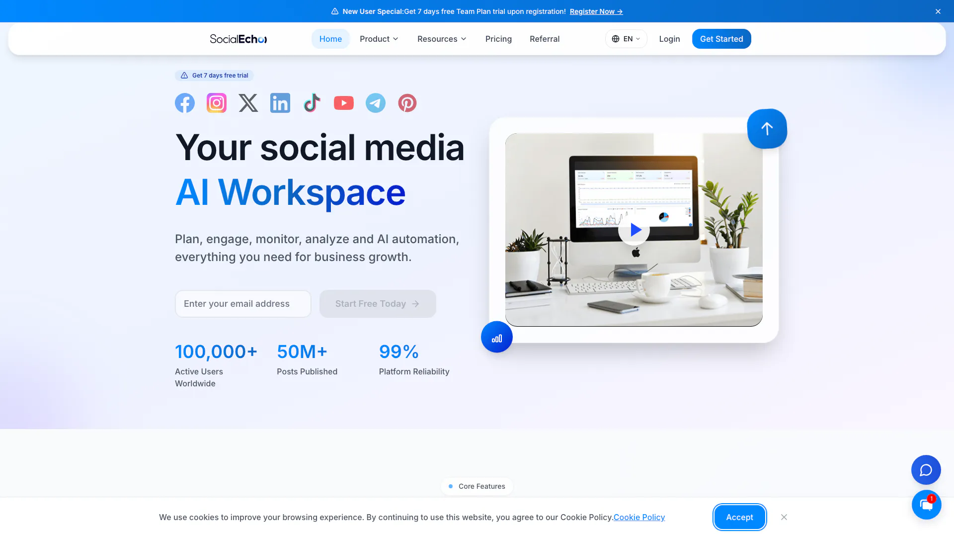- Anmelden: Beginnen Sie mit der Registrierung für eine kostenlose Testversion auf der SocialEcho-Website. Nach der Registrierung haben Sie Zugriff auf eine 7-tägige kostenlose Testversion des Teamplans.