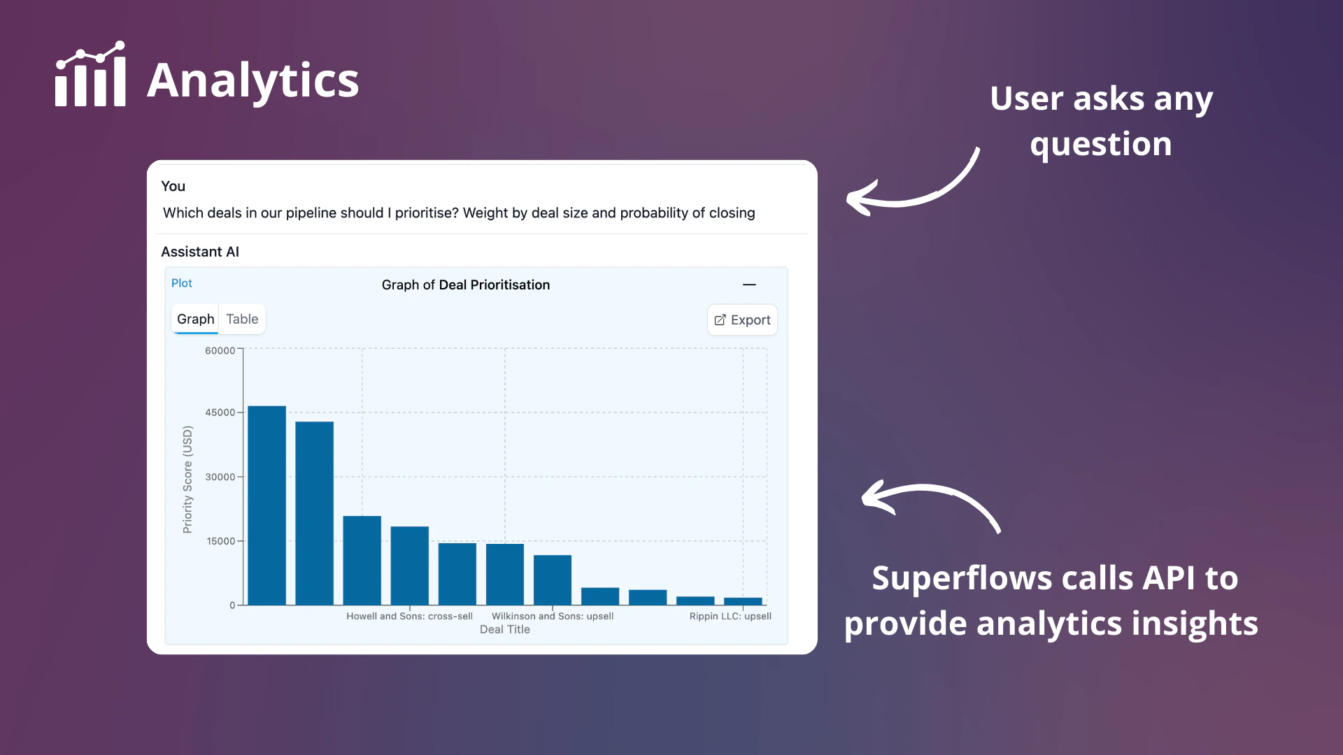 - Analysefähigkeiten: Ruft Daten von den APIs Ihres Produkts ab und verarbeitet sie, um Benutzern innerhalb von Sekunden aufschlussreiche Analysen zu liefern.