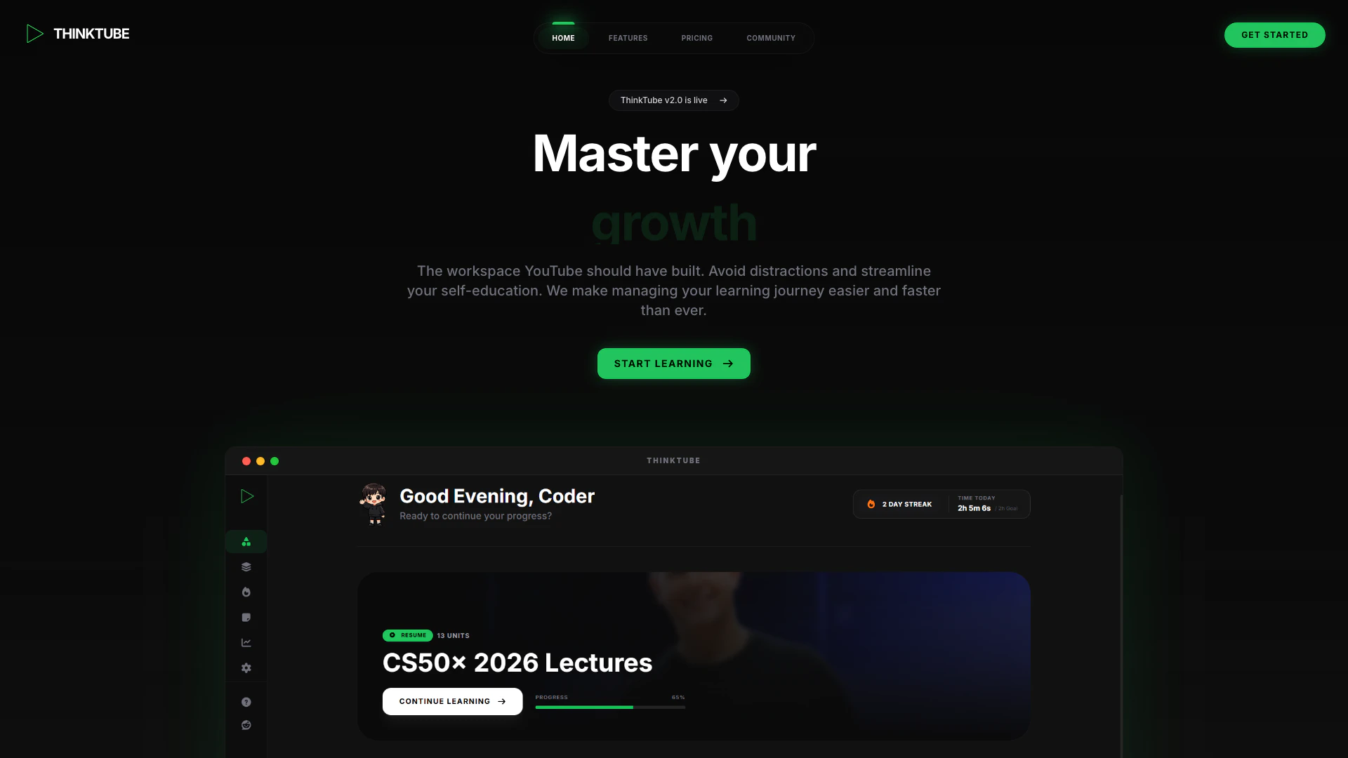 ThinkTube ist eine innovative Plattform, die entwickelt wurde, um Ihr YouTube-Lernerlebnis zu verbessern, indem Sie Ihre Playlists meistern können. Sie bietet leistungsstarke Werkzeuge, um Ihre Lernreise zu organisieren, zu verfolgen und abzuschließen, mit Einblicken, die helfen, Ihre Selbstbildung zu optimieren. ThinkTube zielt darauf ab, Ablenkungen zu beseitigen und passives Zuschauen in aktives Lernen zu verwandeln, und ist besonders vorteilhaft für Studenten und lebenslange Lernende, die das Beste aus ihren Bildungsinhalten auf YouTube herausholen möchten.