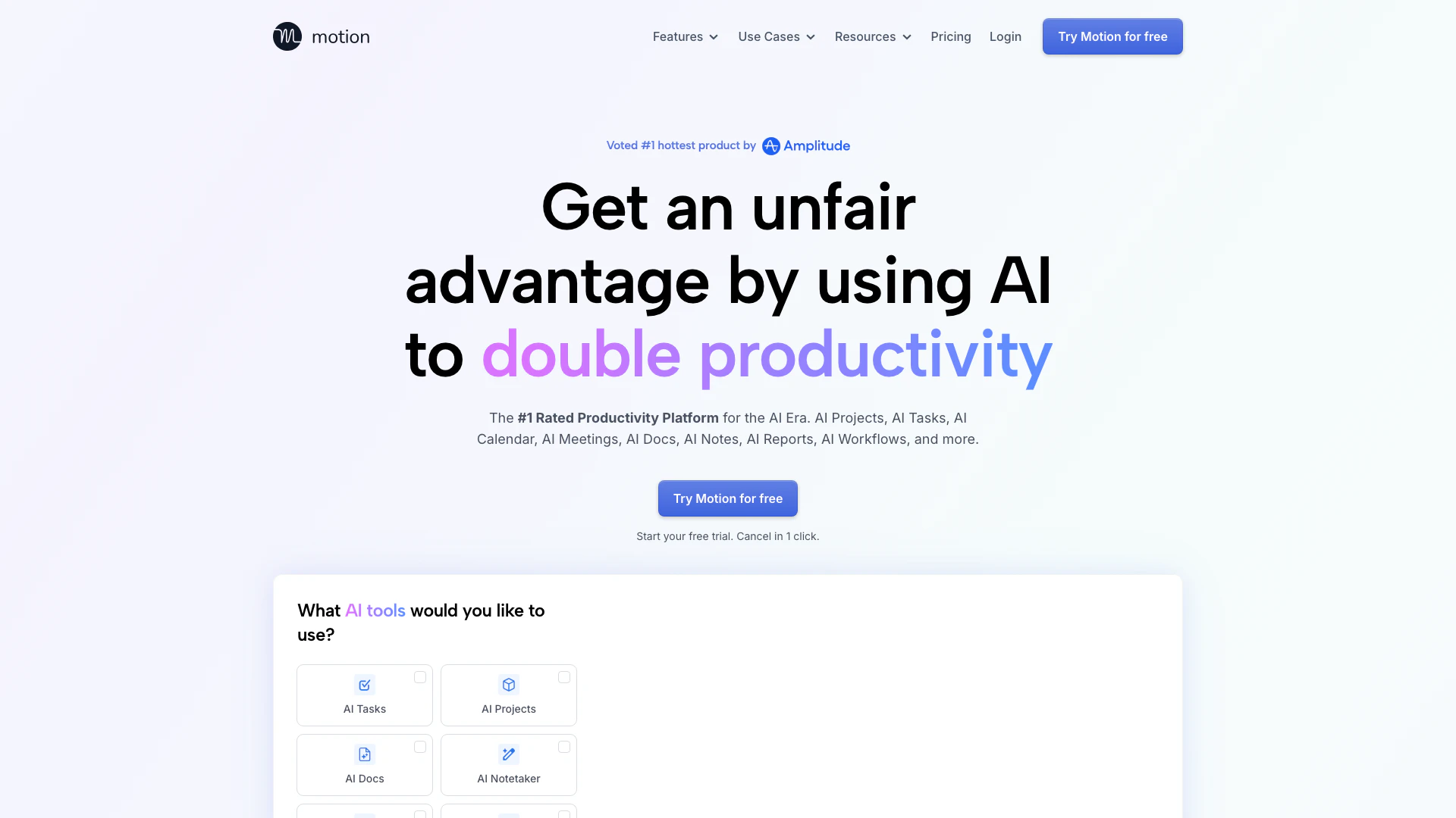 Usemotion ist die am besten bewertete Produktivitätsplattform, die für das KI-Zeitalter entwickelt wurde. Sie integriert verschiedene KI-gesteuerte Tools wie KI-Projekte, KI-Aufgaben, KI-Kalender, KI-Meetings, KI-Dokumente, KI-Notizen, KI-Berichte und KI-Workflows, um die Produktivität zu steigern und Arbeitsabläufe für Einzelpersonen und Teams zu optimieren. Durch den Einsatz fortschrittlicher KI-Technologien automatisiert Usemotion sich wiederholende Aufgaben, verwaltet Projekte nahtlos und optimiert die Planung, sodass Benutzer sich auf das Wesentliche konzentrieren können.