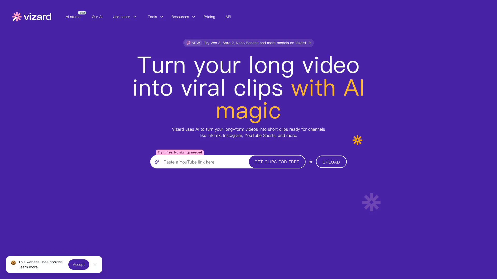 Vizard verwendet KI, um Ihre längeren Videos zu transkribieren, schneidet Sprecher heraus und verarbeitet Ihre Videos, um kurze Clips zu erstellen, die für soziale Medien wie TikTok, Instagram und YouTube bereit sind.