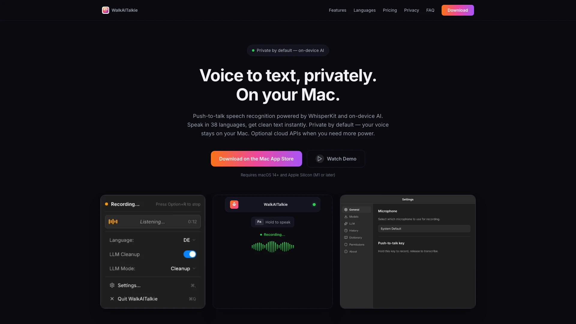 WalkAITalkie benötigt macOS 14 oder höher und Apple Silicon (M1 oder höher).