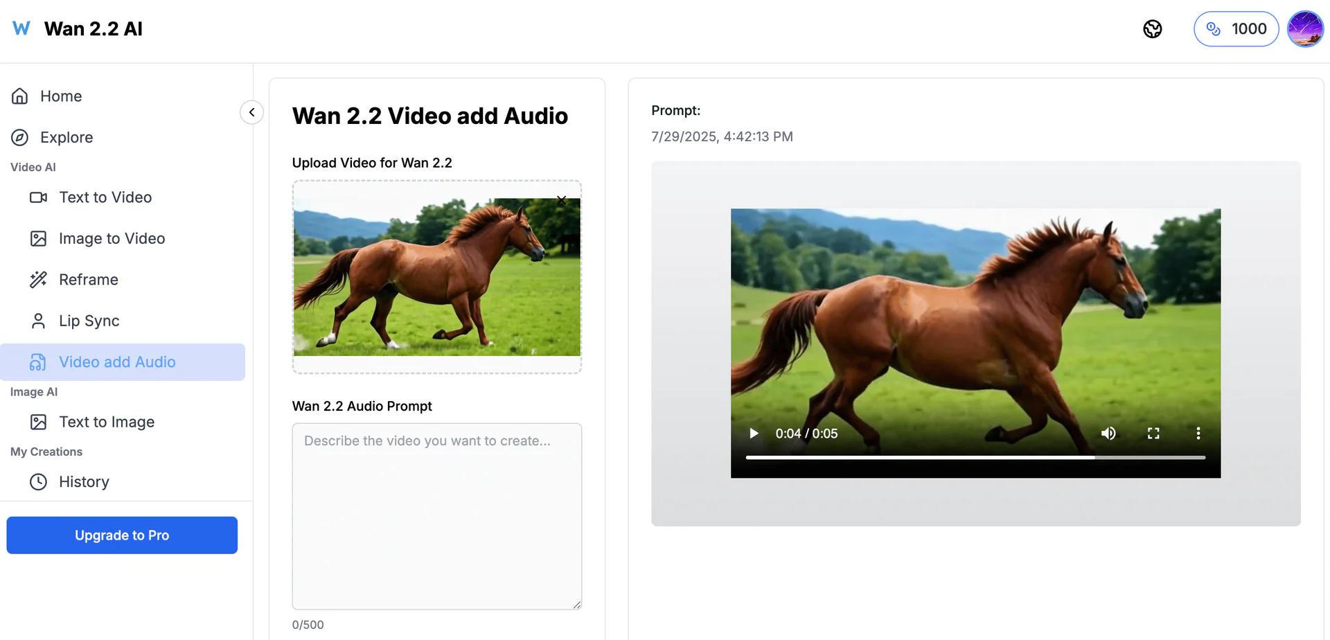 Zusätzliche Wan 2.2 Kredite bei Bedarf, 2000 Wan 2.2 Kredite (~40 Videos), kein Abonnement erforderlich, priorisierte Wan 2.2 Videoerstellung, permanenter Wan 2.2 Videoverlauf.