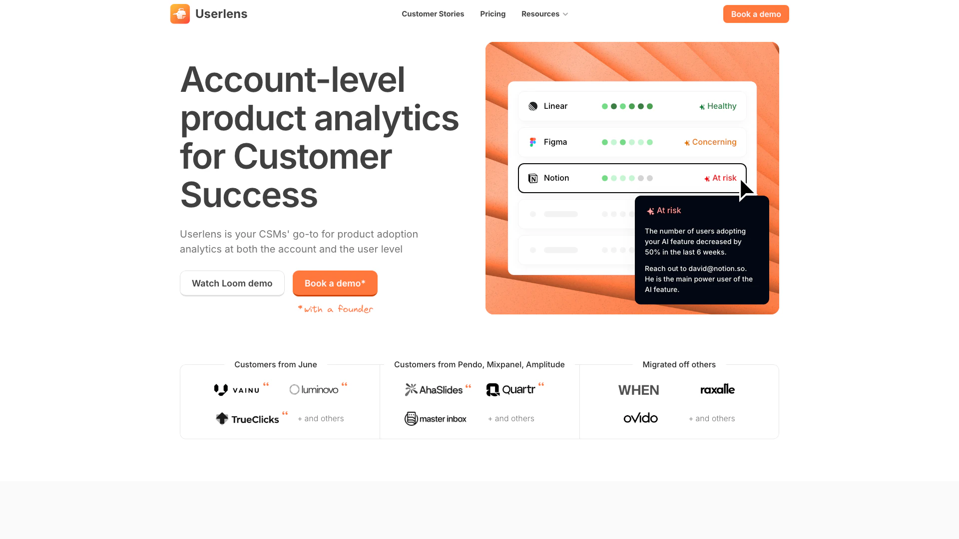 Produktanalyse-Tools sind für die Produktentwicklung gedacht. Sie zeigen Funktionen und Trichter. Benutzer werden auf Statistiken reduziert. Userlens konzentriert sich auf schnelle, klare, kontobasierte Produktanalysen. Jedes Konto und jeder Benutzer im Konto ist einzigartig und nutzt Ihre Plattform unterschiedlich. Wir machen es 30x schneller, alle Ihre Konten und deren Statistiken wie Abwanderungsrisiko, aktive Benutzeranzahl usw. zu sehen. Sie können auch tiefer in einzelne Konten oder Benutzer eintauchen, wenn nötig. Wir integrieren auch mit Mixpanel, Amplitude, PostHog und Segment, sodass Ihre vorhandenen Daten verbunden bleiben, während Sie zu einer kontobasierten Perspektive wechseln.