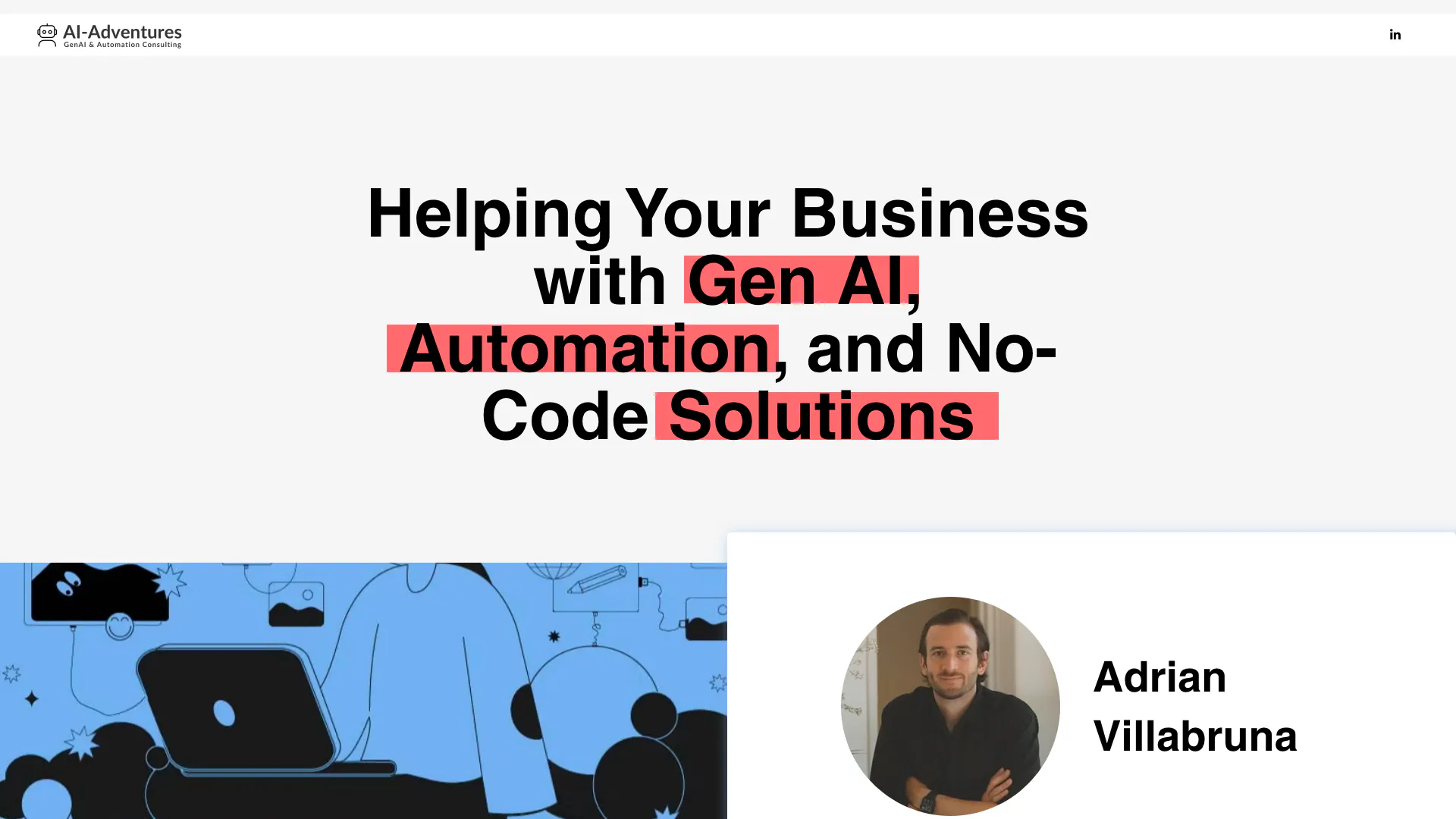 Ai Adventures es una plataforma fundada por Adrian Villabruna, especializada en IA Generativa, automatización de flujos de trabajo y desarrollo sin código. Ofrece soluciones innovadoras para que las empresas optimicen procesos y mejoren la experiencia del cliente, utilizando herramientas y estrategias impulsadas por IA.