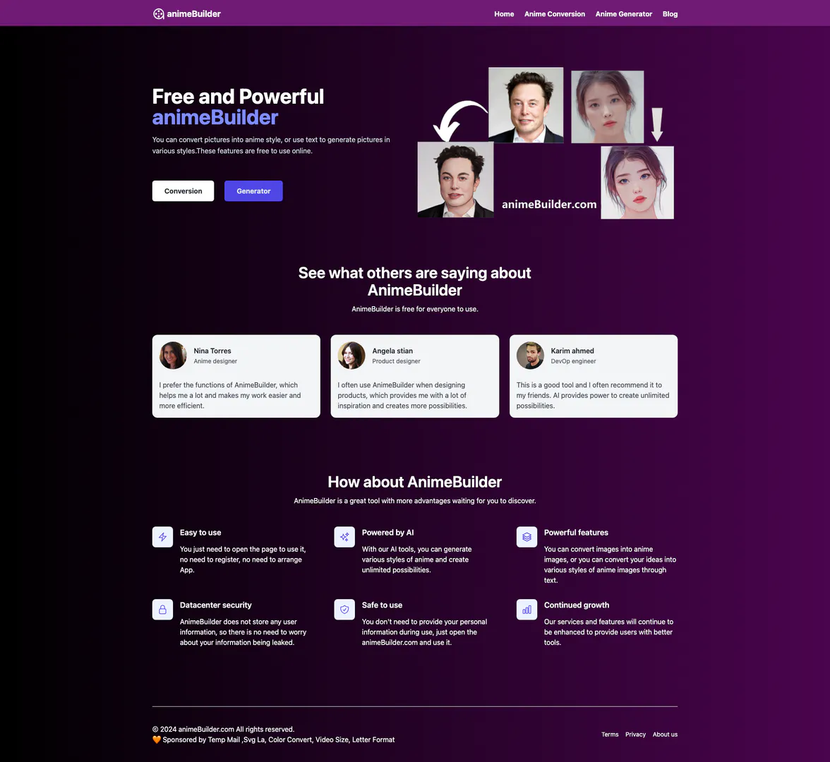 - Fácil de Usar: AnimeBuilder es fácil de usar, no requiere registro ni instalación de aplicaciones, lo que permite un acceso inmediato a sus funciones.