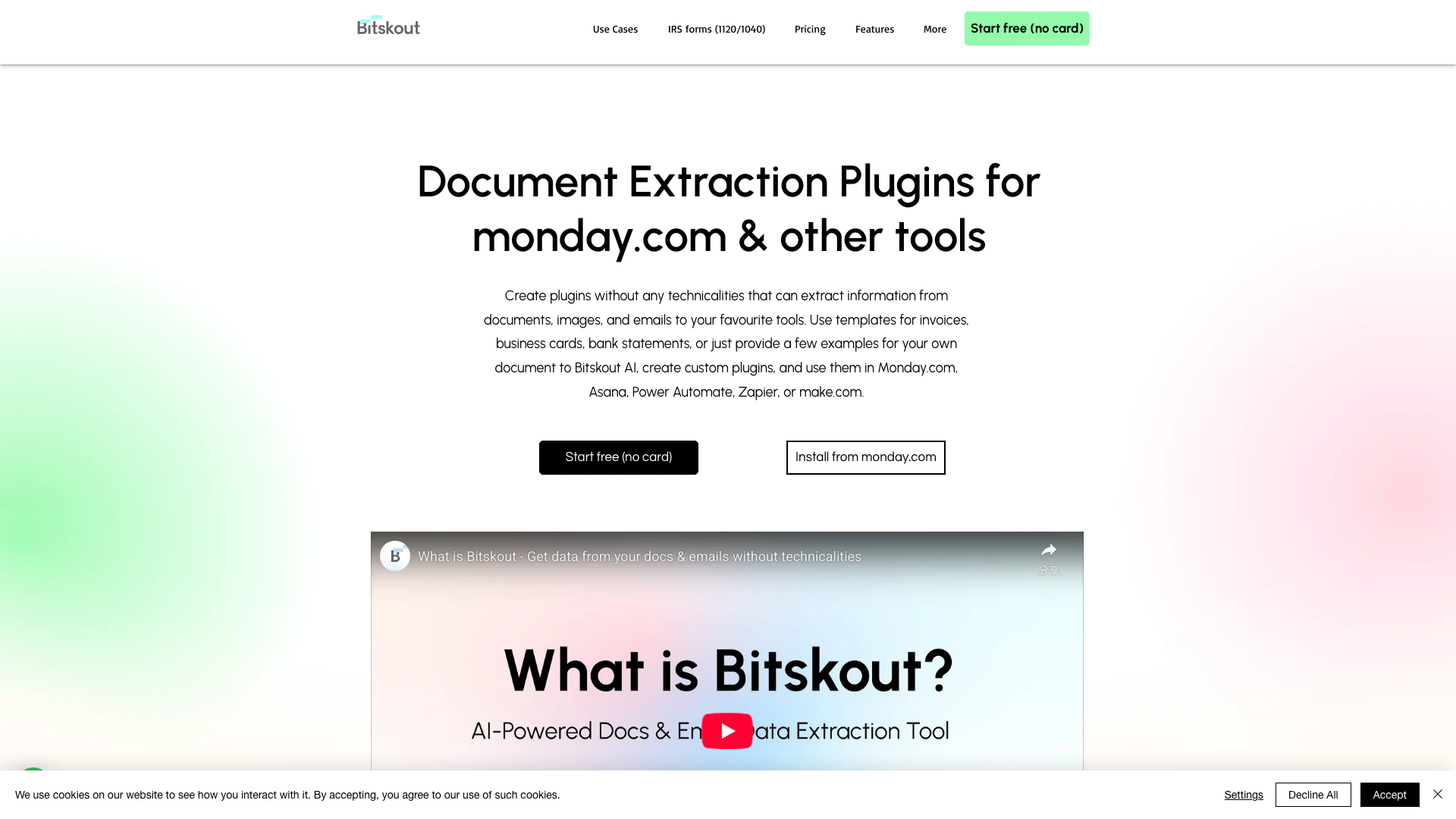 Bitskout es una herramienta innovadora de extracción de datos diseñada para extraer información de diversos documentos, incluidos facturas, contratos y extractos bancarios, e integrar estos datos en plataformas populares de gestión de proyectos como monday.com, Asana, Zapier y Power Automate. El valor fundamental de Bitskout radica en su capacidad para automatizar la extracción de datos sin requerir habilidades de codificación, lo que lo hace accesible para usuarios de todos los niveles técnicos. Al utilizar plantillas predefinidas y complementos personalizables, Bitskout empodera a los usuarios para optimizar sus flujos de trabajo y mejorar la productividad al reducir el tiempo dedicado a la entrada manual de datos.