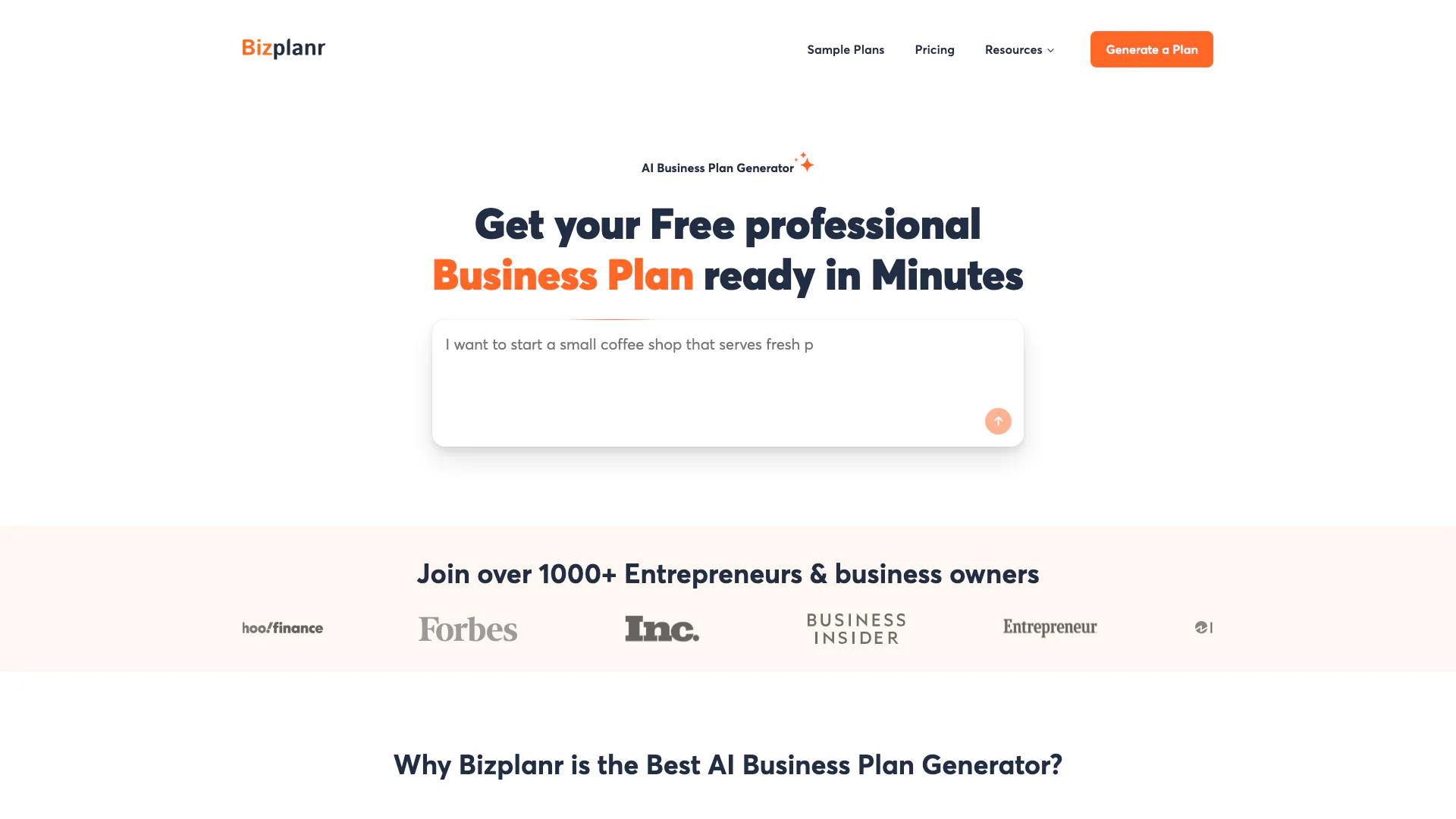 - Visita el sitio web de Bizplanr y selecciona 'Generar un Plan'.