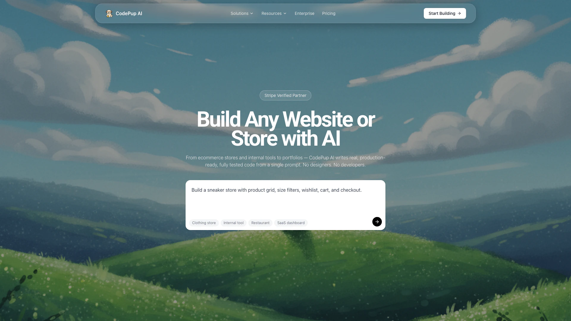 CodePup AI builds production-ready websites and online stores from text prompts. It can create various types of sites including ecommerce stores, portfolios, and business sites without requiring any coding.