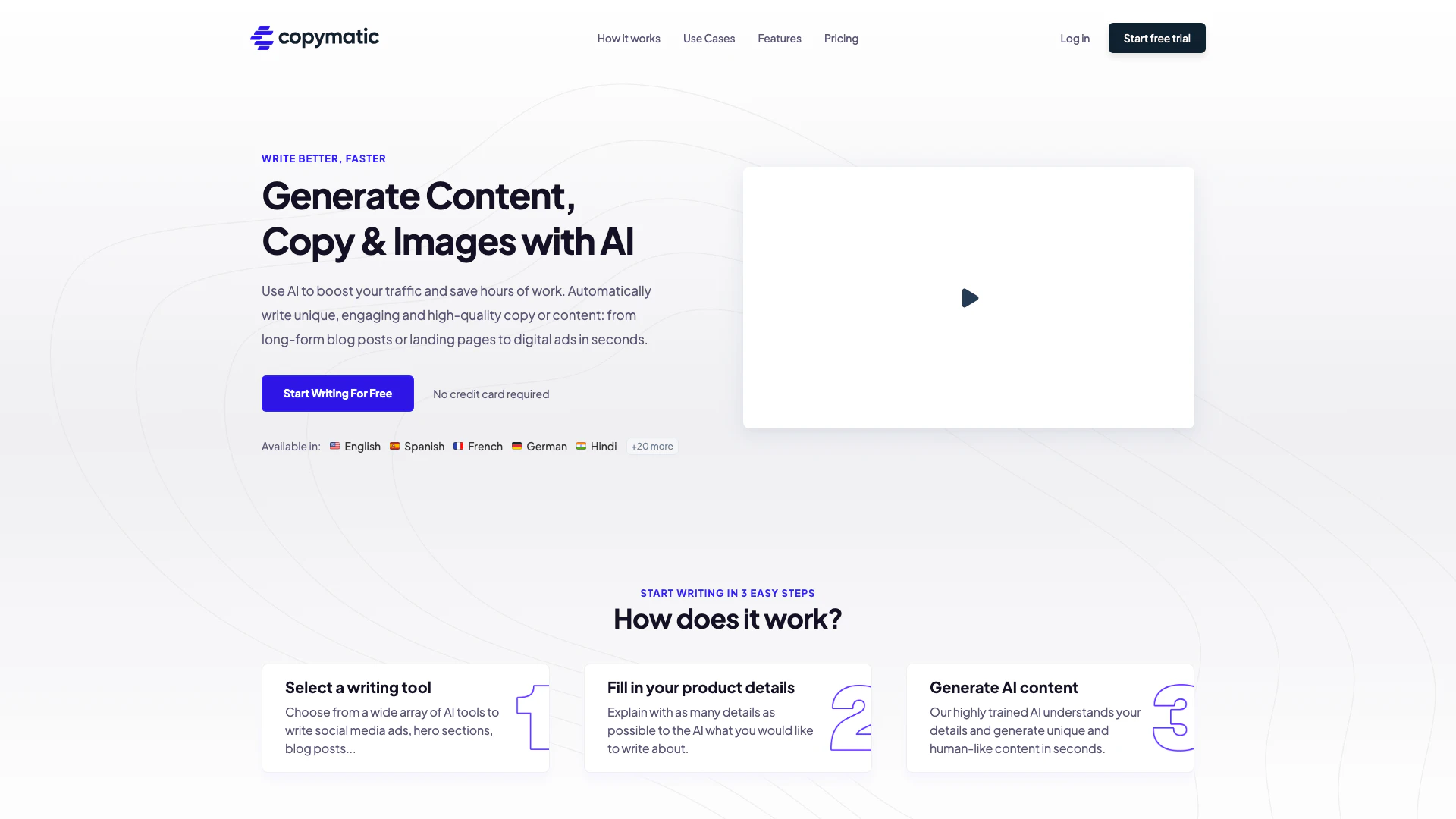 - Generación de Contenido Impulsada por IA: Copymatic utiliza tecnología avanzada de IA para generar contenido único y atractivo rápidamente, lo que lo hace adecuado para diversas necesidades de escritura.