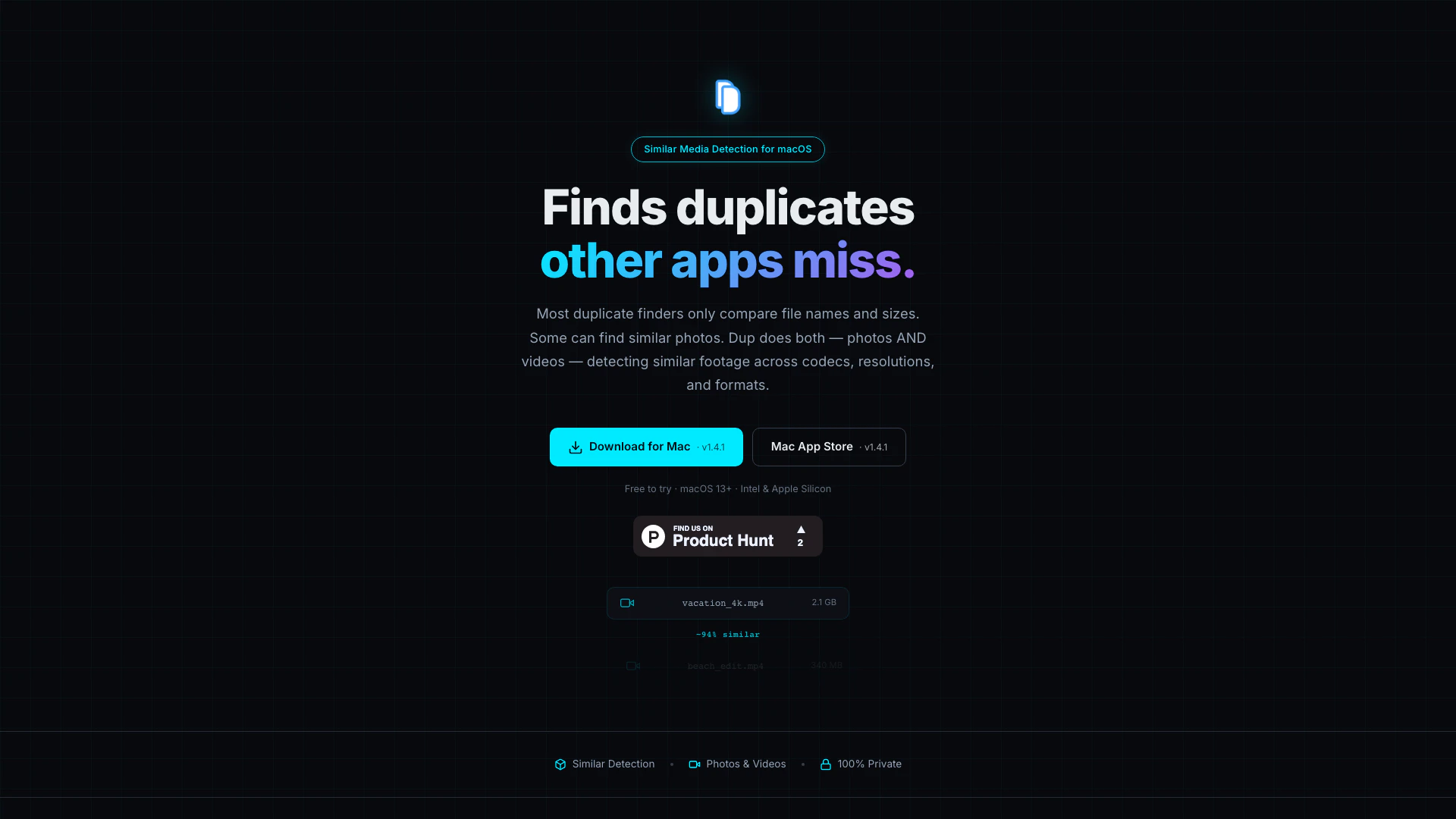 Dup es una poderosa aplicación para Mac diseñada para encontrar fotos y videos similares, no solo duplicados exactos. A diferencia de la mayoría de los buscadores de duplicados que solo comparan nombres de archivos y tamaños, Dup analiza el contenido visual de los archivos multimedia, detectando material similar a través de varios códecs, resoluciones y formatos. Es la única aplicación de su tipo para macOS, permitiendo a los usuarios limpiar eficientemente sus bibliotecas multimedia identificando y eliminando duplicados innecesarios mientras aseguran que sus archivos permanezcan privados y seguros en sus dispositivos.
