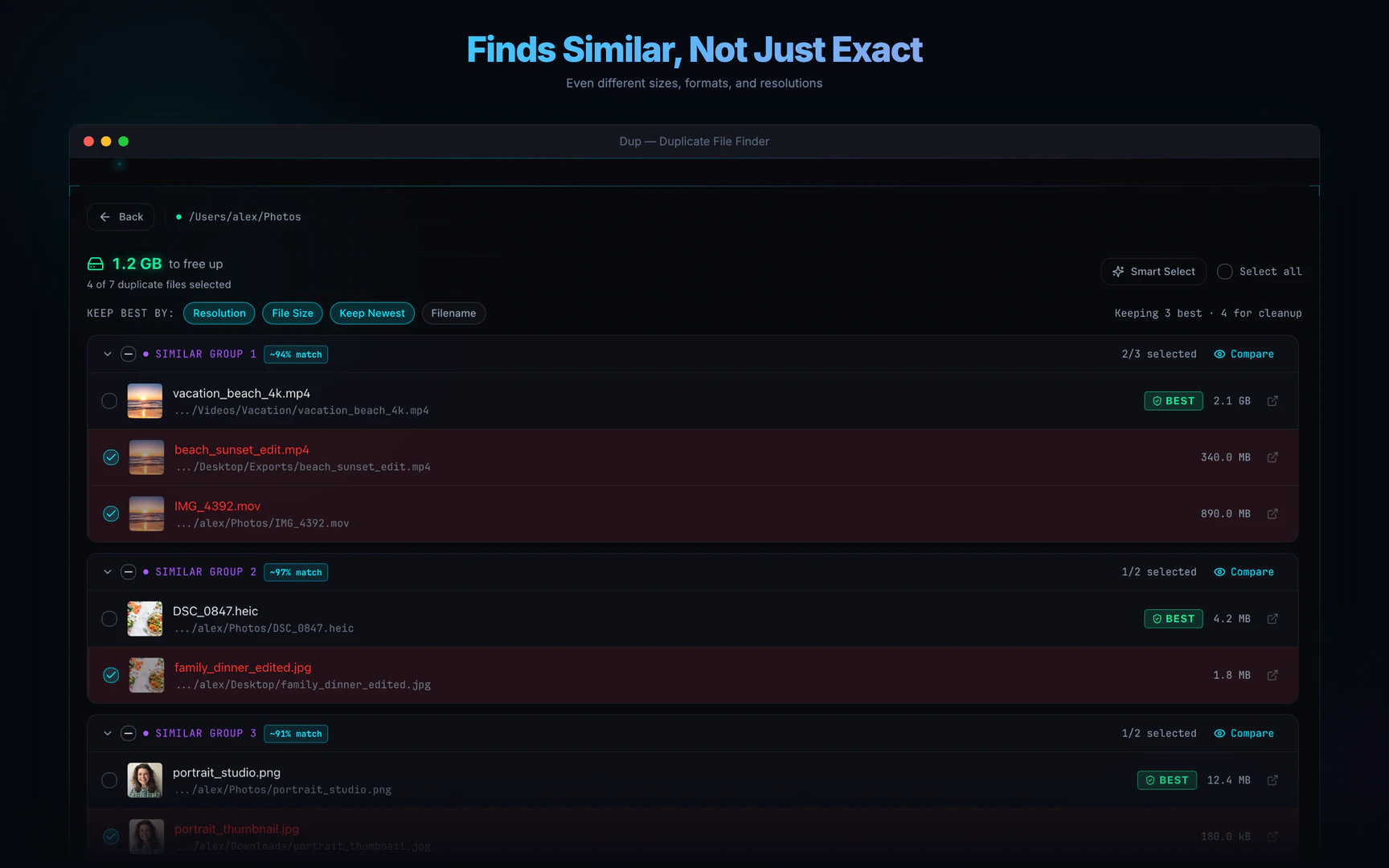 - Selección Inteligente: Selecciona automáticamente los mejores archivos para mantener según criterios como resolución, fecha y tamaño.