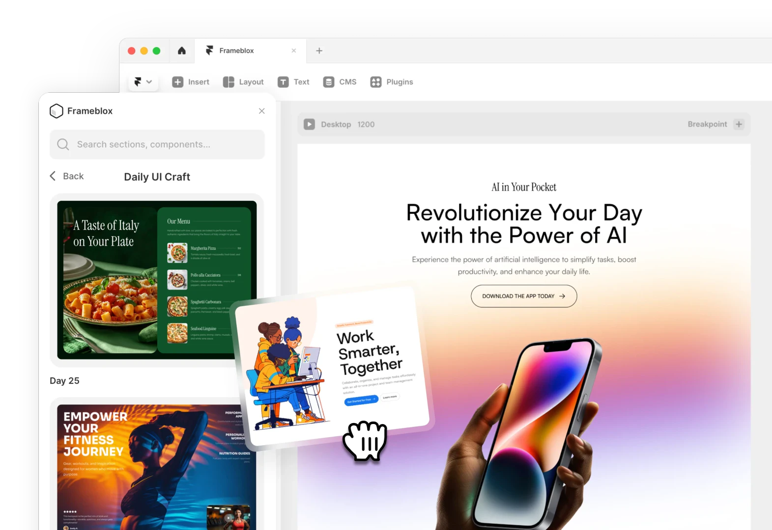 - Sistema de Diseño que Ahorra Tiempo: Con una interfaz de arrastrar y soltar, Frameblox permite a los usuarios lanzar sitios web más rápido, ahorrando innumerables horas en el proceso de diseño.