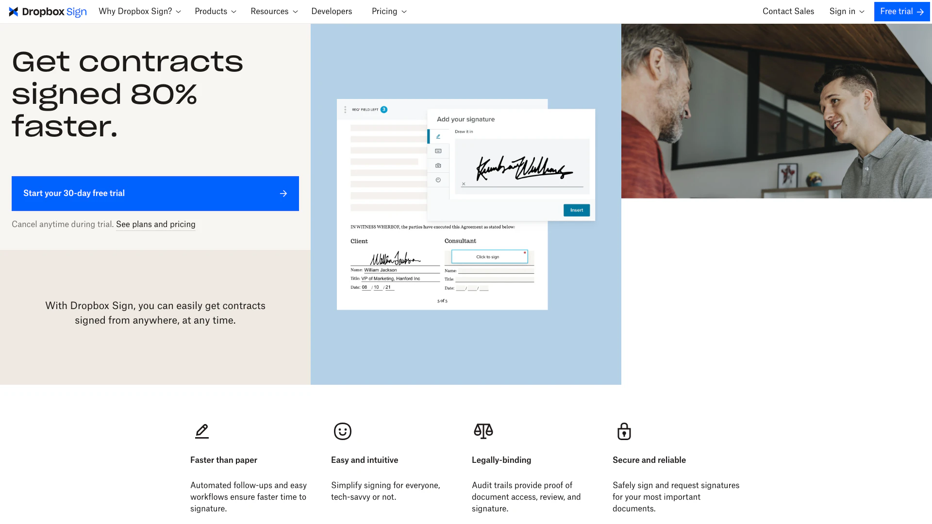 Dropbox Sign ofrece una firma más rápida que el papel, es fácil e intuitivo para todos, proporciona firmas legalmente vinculantes y garantiza firmas seguras y confiables para documentos importantes.