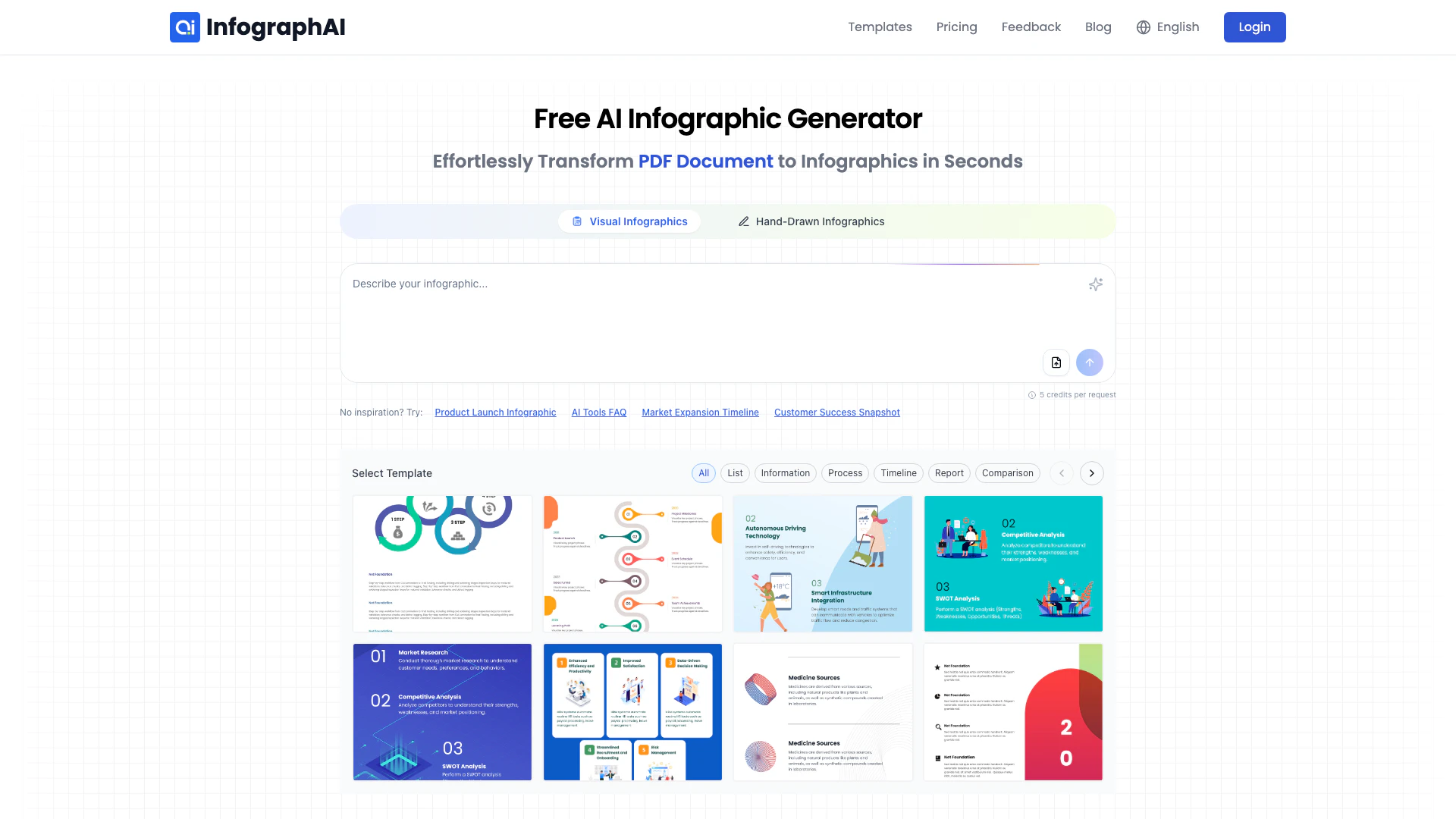 Usar Infographai para crear infografías es simple y se puede hacer en cinco pasos fáciles: 1. Elige una plantilla de infografía: Comienza seleccionando entre miles de plantillas de infografía personalizables adaptadas a diversas industrias. 2. Ingresa datos o URL: Agrega tu texto, sube un archivo o pega una URL de blog para generar una infografía. 3. Genera infografía con IA: Deja que el generador impulsado por IA cree un visual impresionante al instante. 4. Personaliza tu infografía: Edita fuentes, colores y estilos para hacer que tu infografía sea única y atractiva. 5. Guarda y descarga: Descarga tu infografía como un PDF o guárdala en tu panel de control para futuras ediciones.