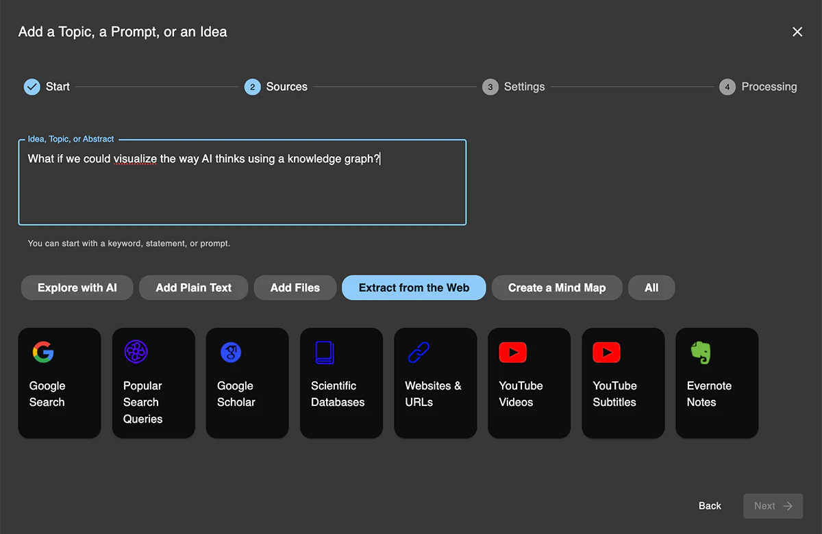 - Importación de Múltiples Fuentes: Soporta la importación de datos de varios formatos, incluidos PDFs, CSVs, resultados de búsqueda de Google y transcripciones de YouTube.