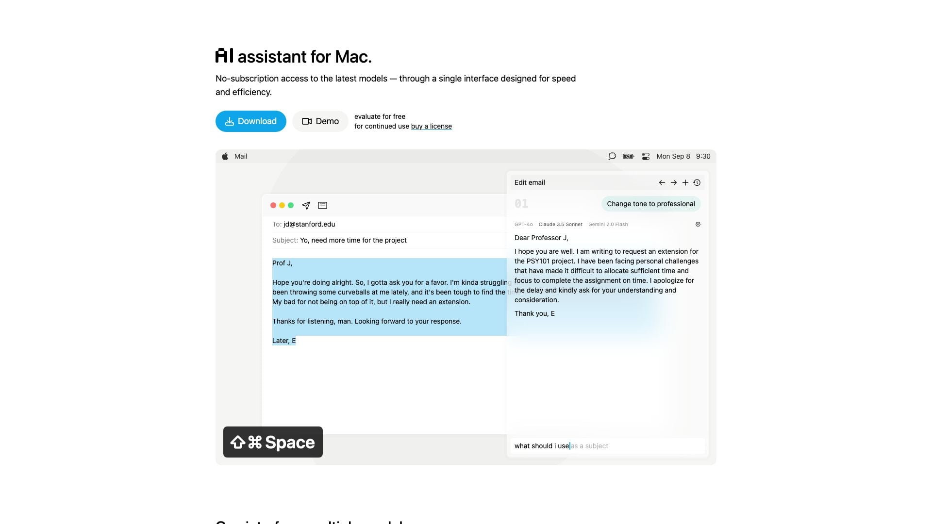 Descargue Intellibar y conéctese a los proveedores de modelos deseados, utilizando una única interfaz para enviar solicitudes y comparar respuestas de múltiples modelos, y también puede usar modelos locales para manejar datos sensibles.